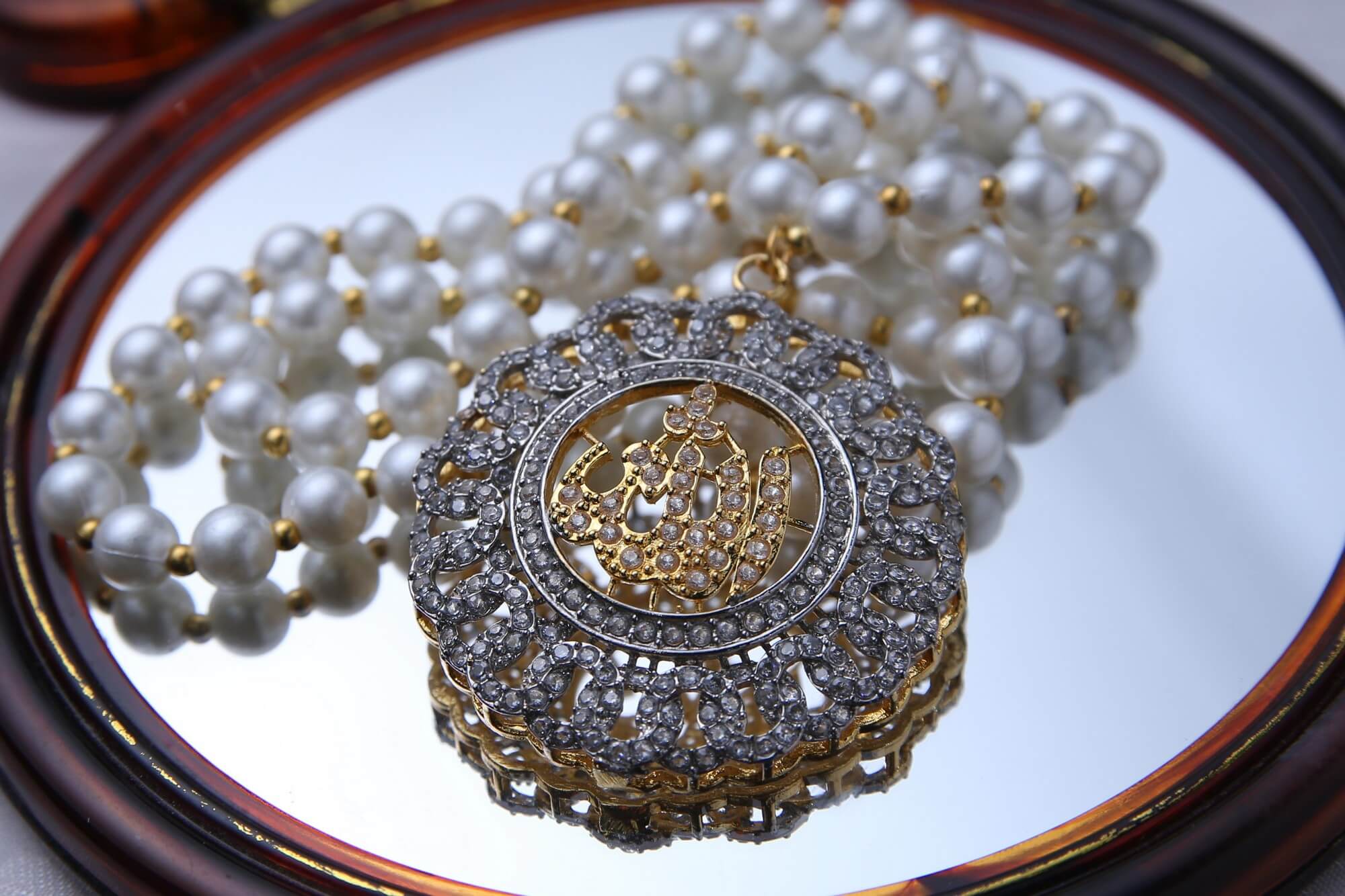 The gorgeous pendant on this excellent necklace has the holy word “Allah” engraved in fine goldwork. The pendant, encircled by glistening pearls and diamonds, emanates grace and serenity. The piece is finished with the tiny pearl strand, which makes it a meaningful and classic accessory.