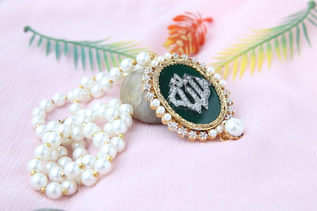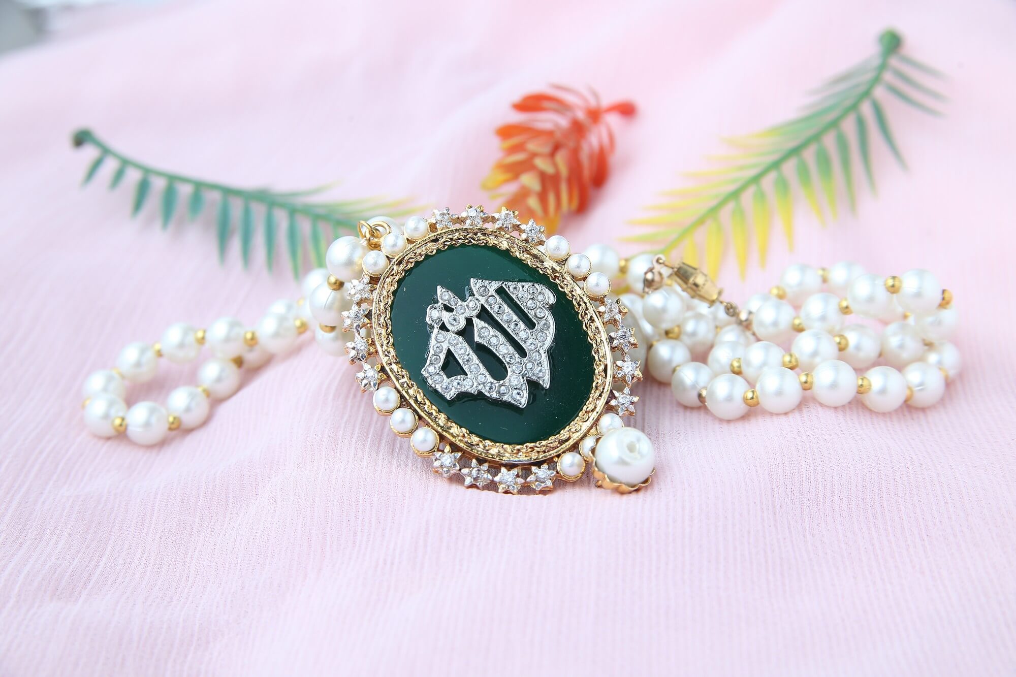 With a brilliant green enamel background, this gorgeous necklace showcases a stunning pendant engraved with the Arabic lettering for “Allah,” beautifully created in glittering diamonds. The pendant is enclosed by a delicate gold-tone setting, decorated with sparkling white pearls that offer a touch of classic elegance. Longevity and beauty are guaranteed by the careful stringing of the pearls on a strong thread. This item is a significant and fashionable addition for any occasion since it skillfully blends spiritual value with elegant style.