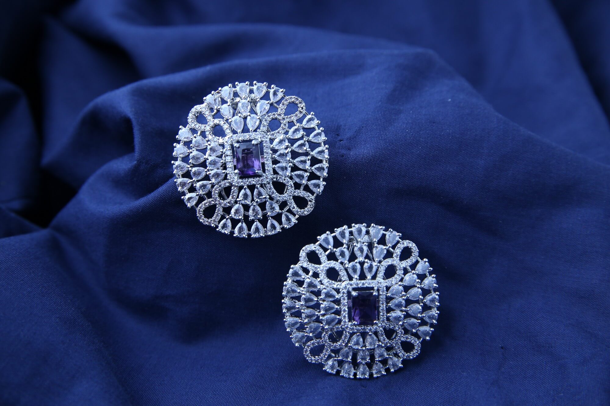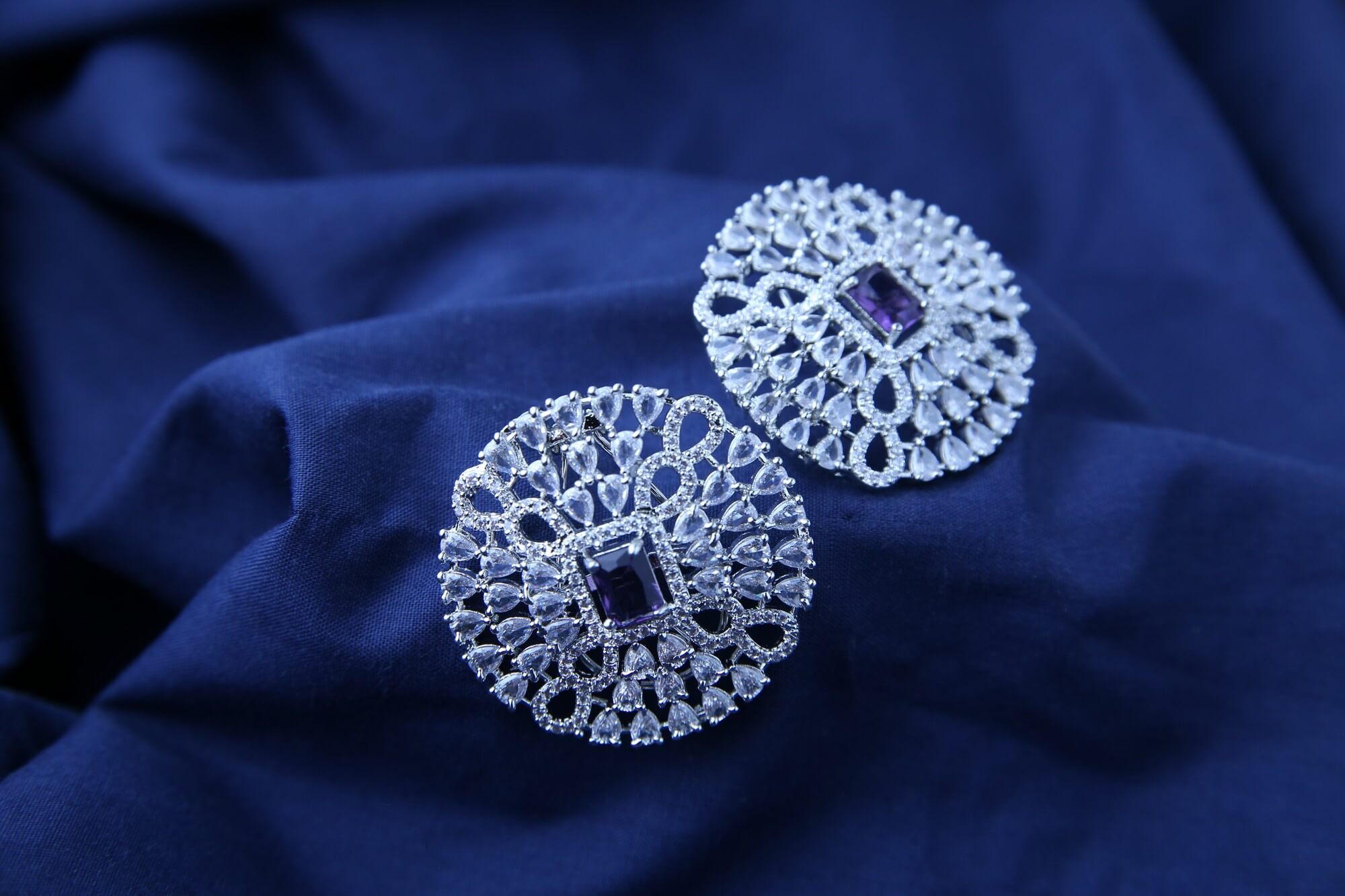 Add a touch of regal elegance to your look with these Allure Stud Earrings. Each earring features a captivating amethyst-toned stone, radiating a rich, vibrant hue. The gemstone is nestled within a halo of sparkling clear crystals, meticulously arranged to maximize brilliance and capture the light from every angle. The polished silver setting complements the deep purple tones, creating a luxurious and eye-catching design. These earrings are the perfect accessory to add a touch of glamour and sophistication to any attire.
