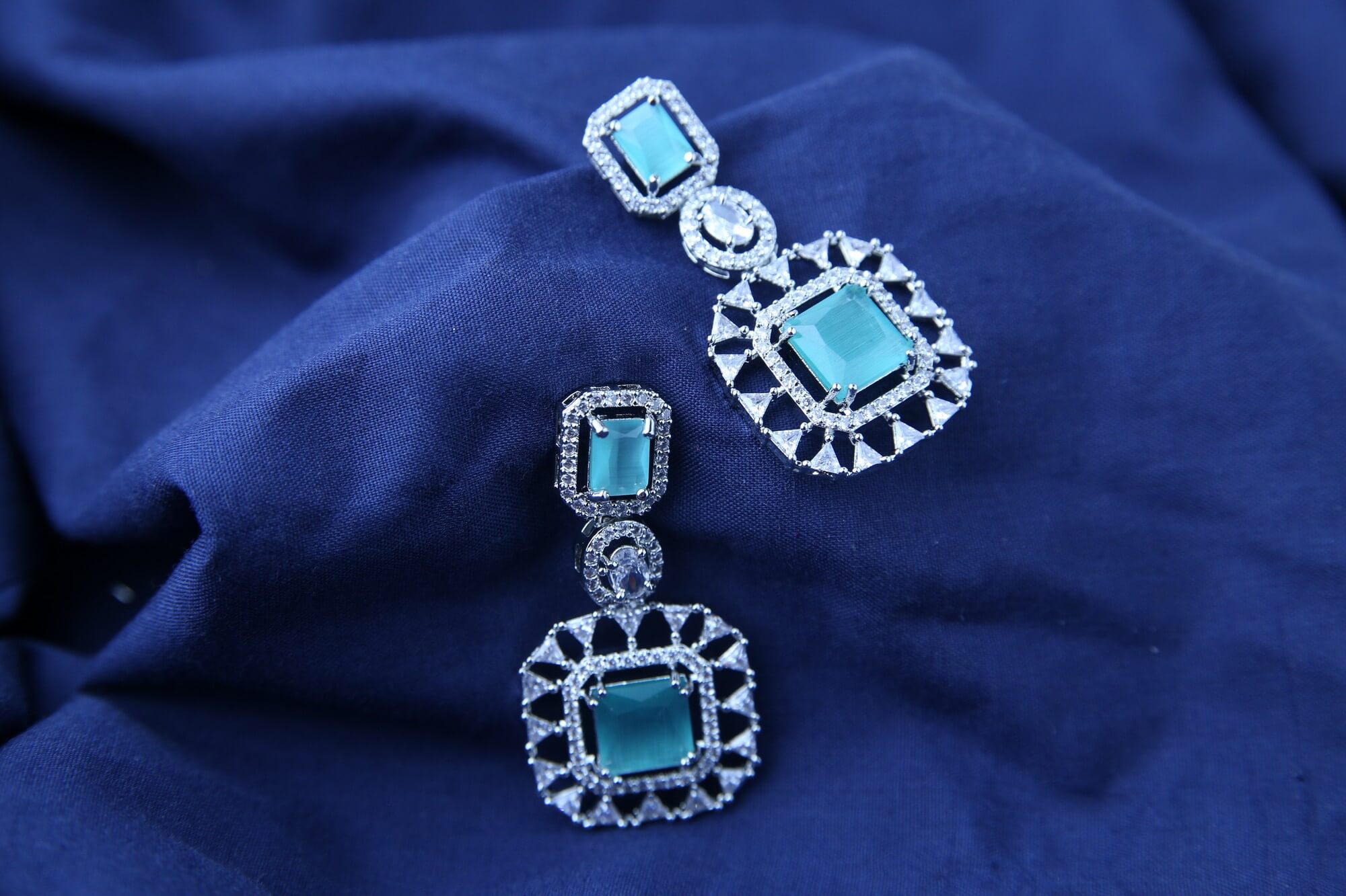 Capture the tranquility of the ocean with these serene seafoam aquamarine and diamond drop earrings. Each earring features a mesmerizing aquamarine gemstone, reminiscent of crystal-clear waters, cut into elegant rectangular and square shapes. The soft, calming blue-green hue of the aquamarines evokes a sense of peace and sophistication. A delicate halo of sparkling white diamonds surrounds each aquamarine, enhancing the serene blue tones and adding a touch of radiant sparkle. The contrast between the cool aquamarines and the dazzling diamonds creates a captivating and refined look.