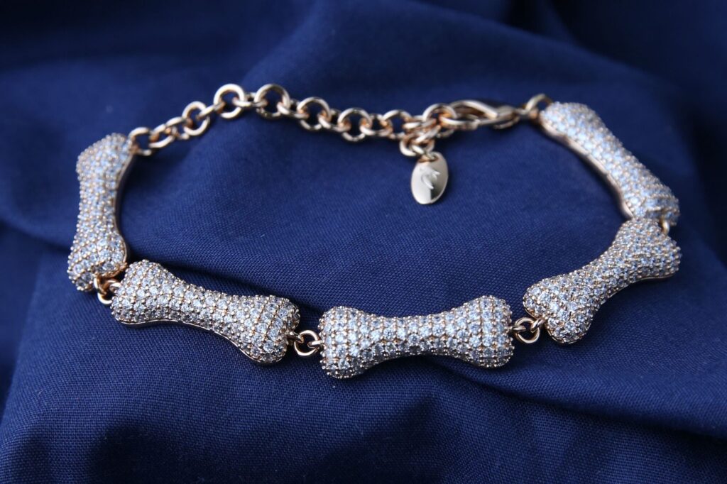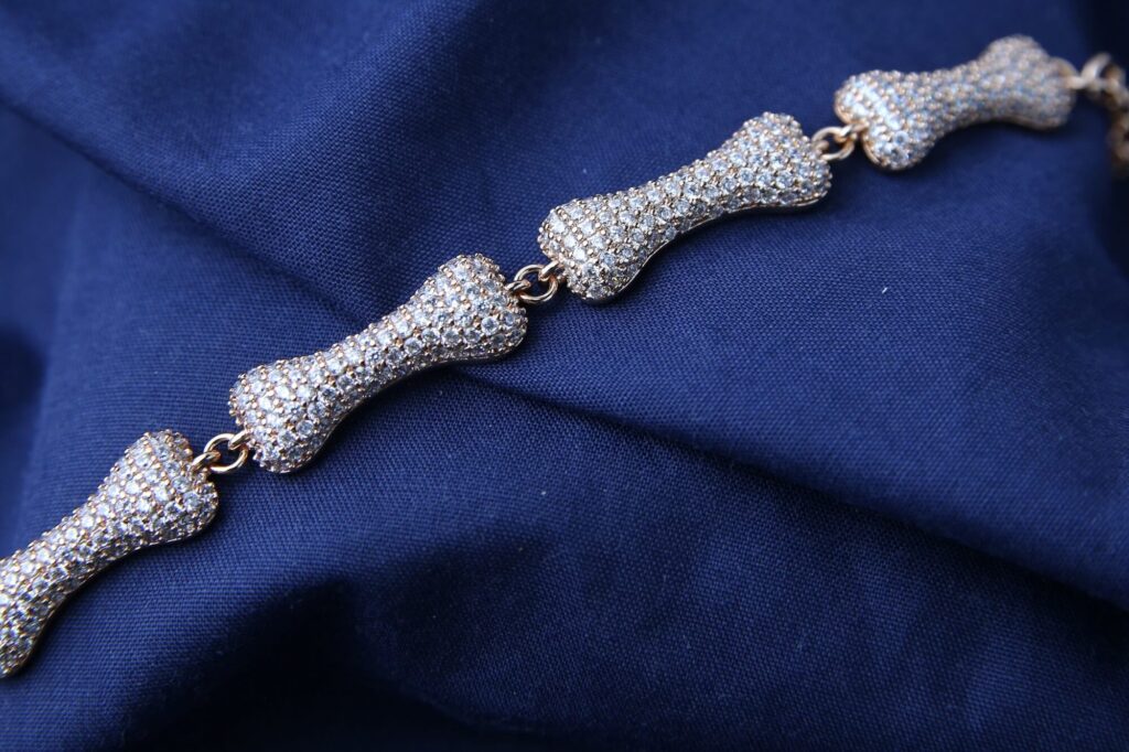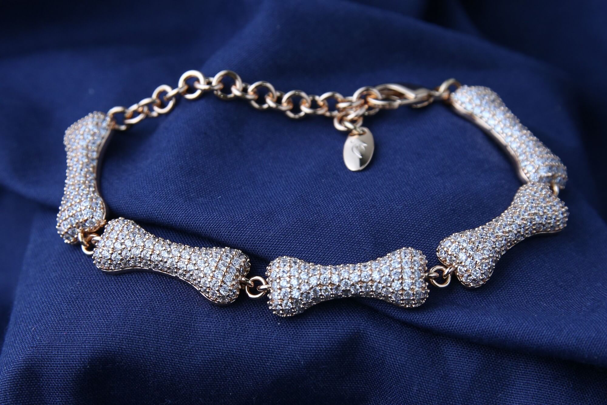 Edgy glamour meets delicate sparkle in the Crystalline Bone Bracelet. Intricately detailed bone-shaped links, encrusted with shimmering crystals, create a unique statement piece. A touch of rebellious spirit, beautifully refined.