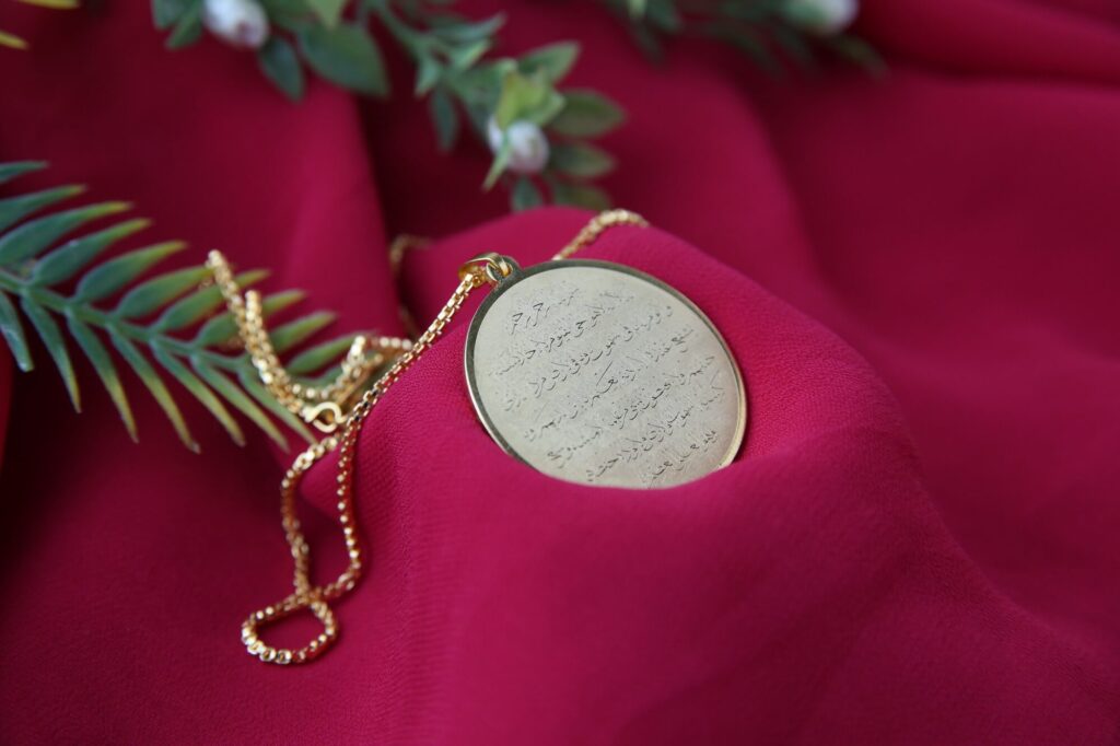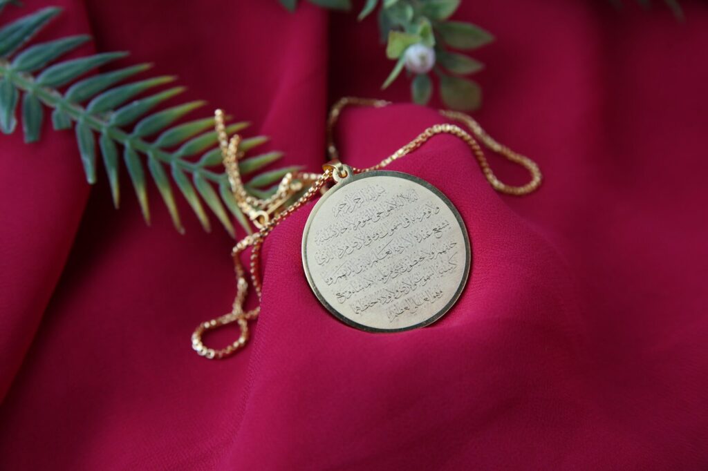Carry the protective blessings of Ayatul Kursi with this beautifully crafted pendant. The round shape pendant with gold chain features the revered Ayatul Kursi verse from the Quran .This timeless piece serves as a reminder of faith and offers spiritual comfort. it’s a cherished and meaningful piece of jewelry.