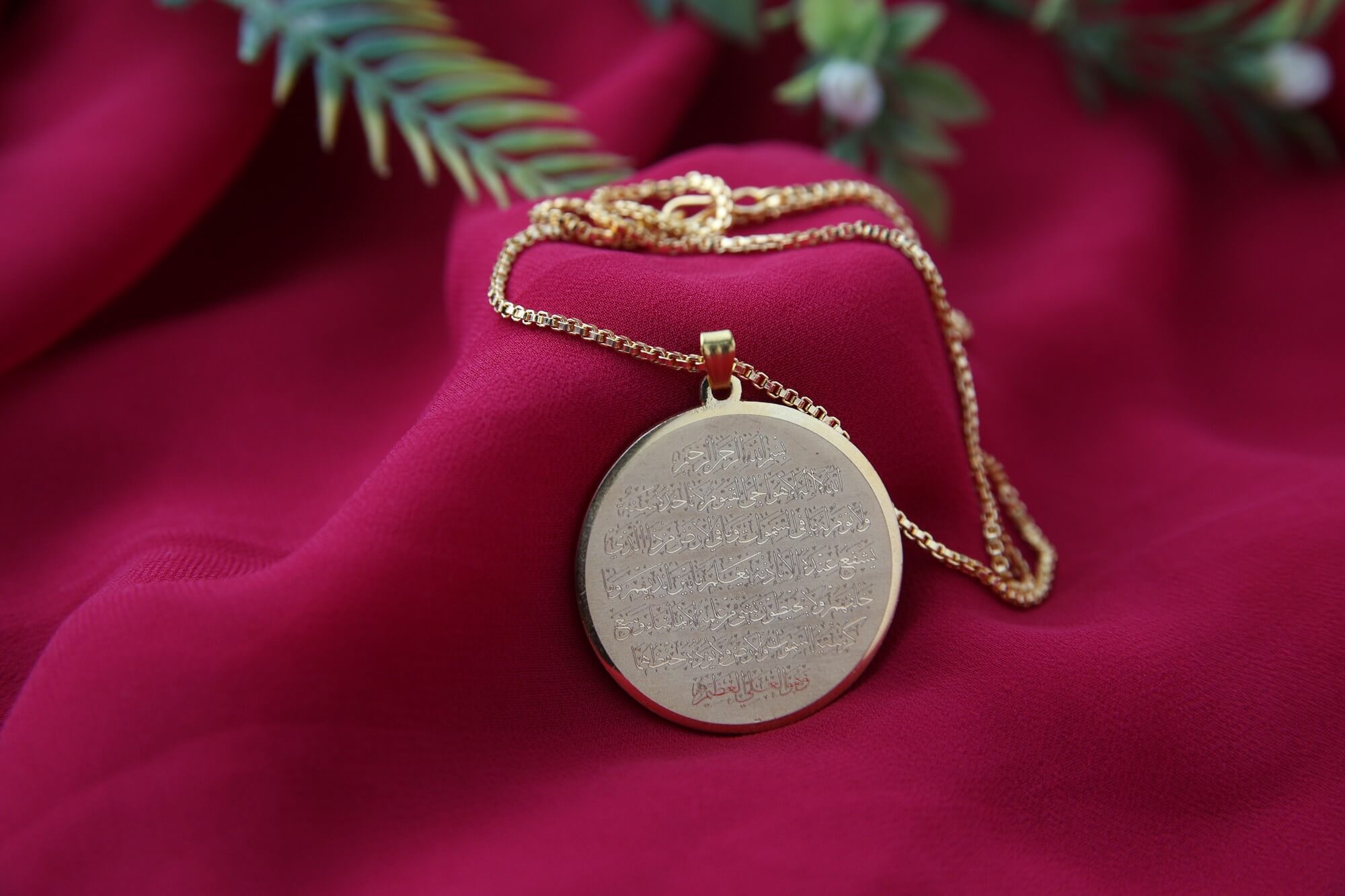 Carry the protective blessings of Ayatul Kursi with this beautifully crafted pendant. The round shape pendant with gold chain features the revered Ayatul Kursi verse from the Quran .This timeless piece serves as a reminder of faith and offers spiritual comfort. it’s a cherished and meaningful piece of jewelry.