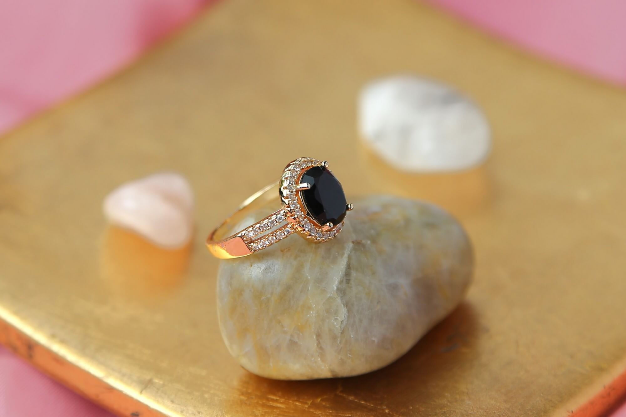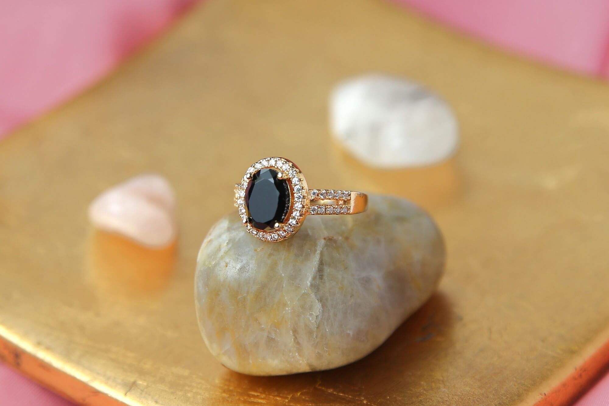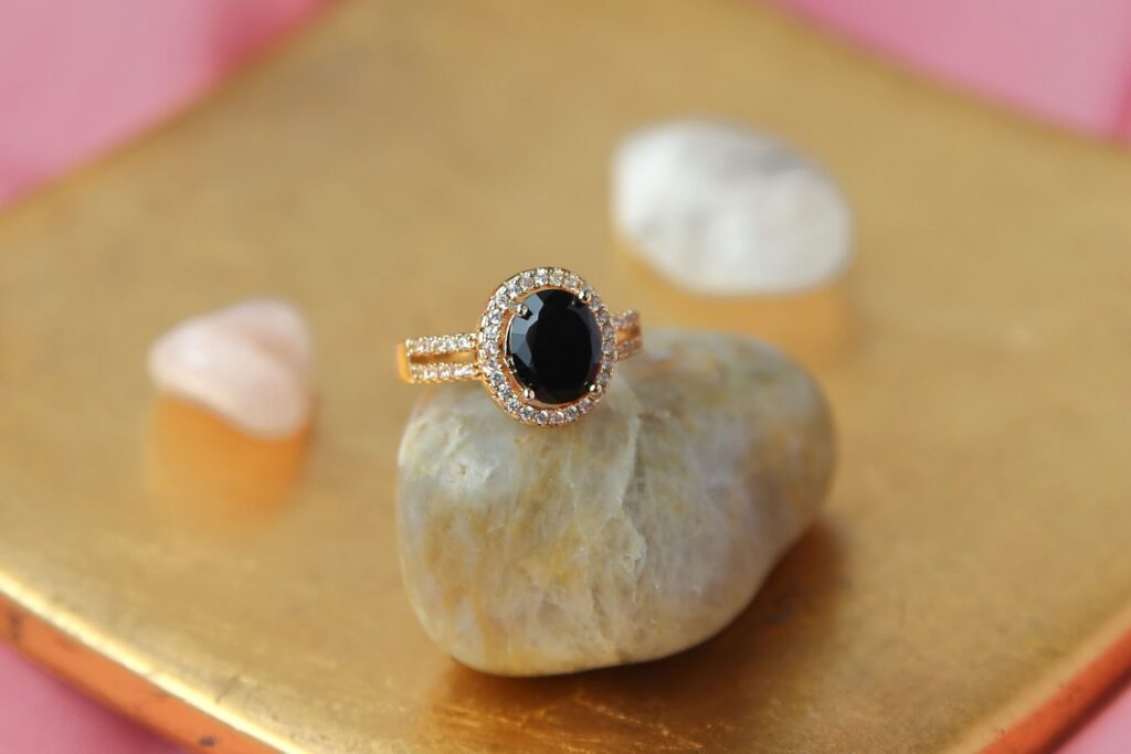 On a smooth, pale stone, a gorgeous gold ring with a huge oval black gemstone encircled by glittering white diamonds takes center stage. The gentle pink tones around the ring lend a sense of romantic elegance, while the warm gold tones of the background highlight the ring’s opulent attractiveness even more.