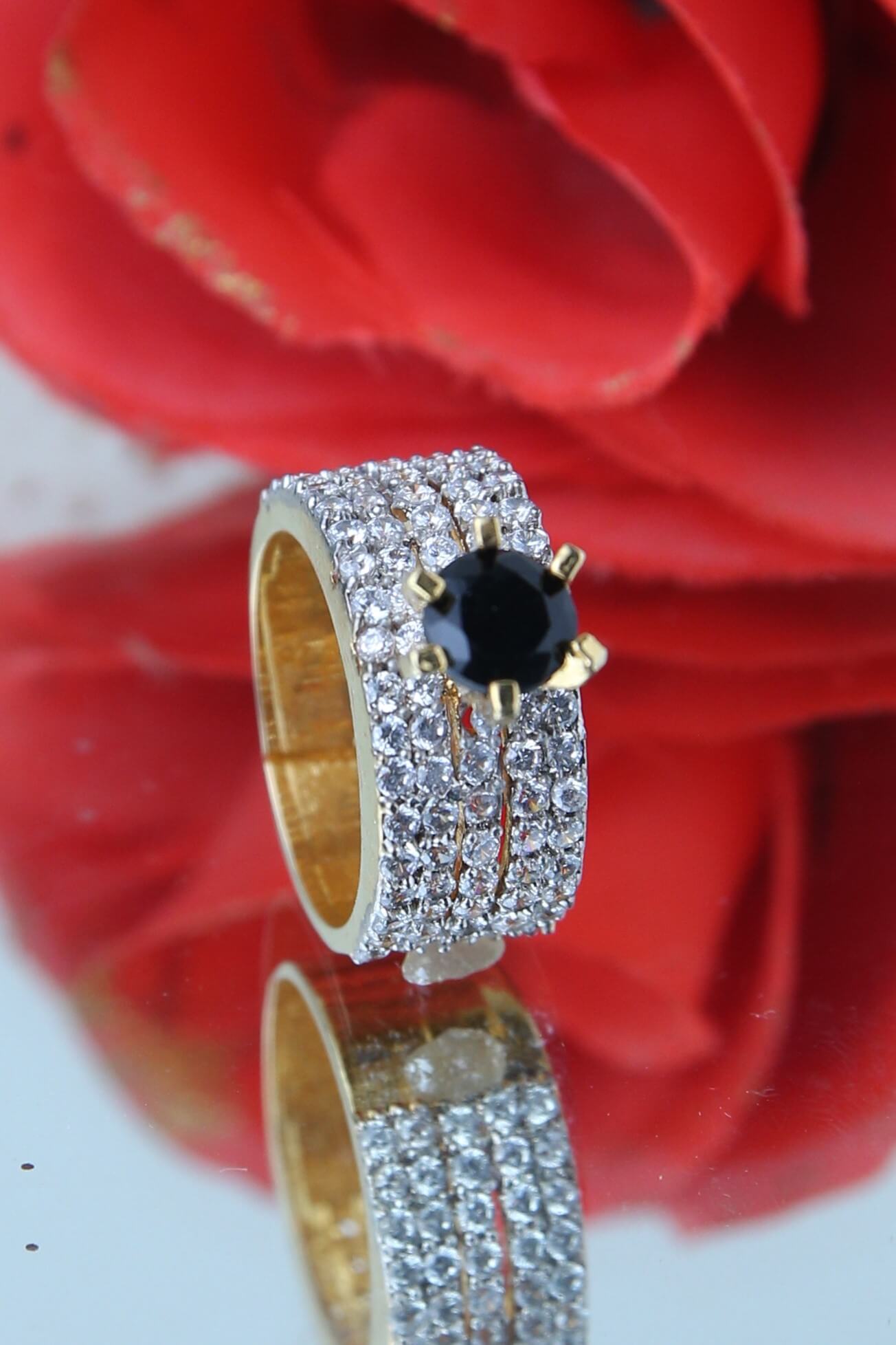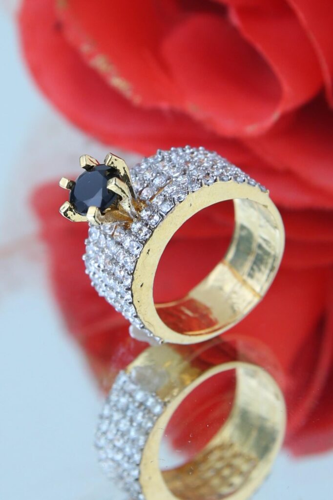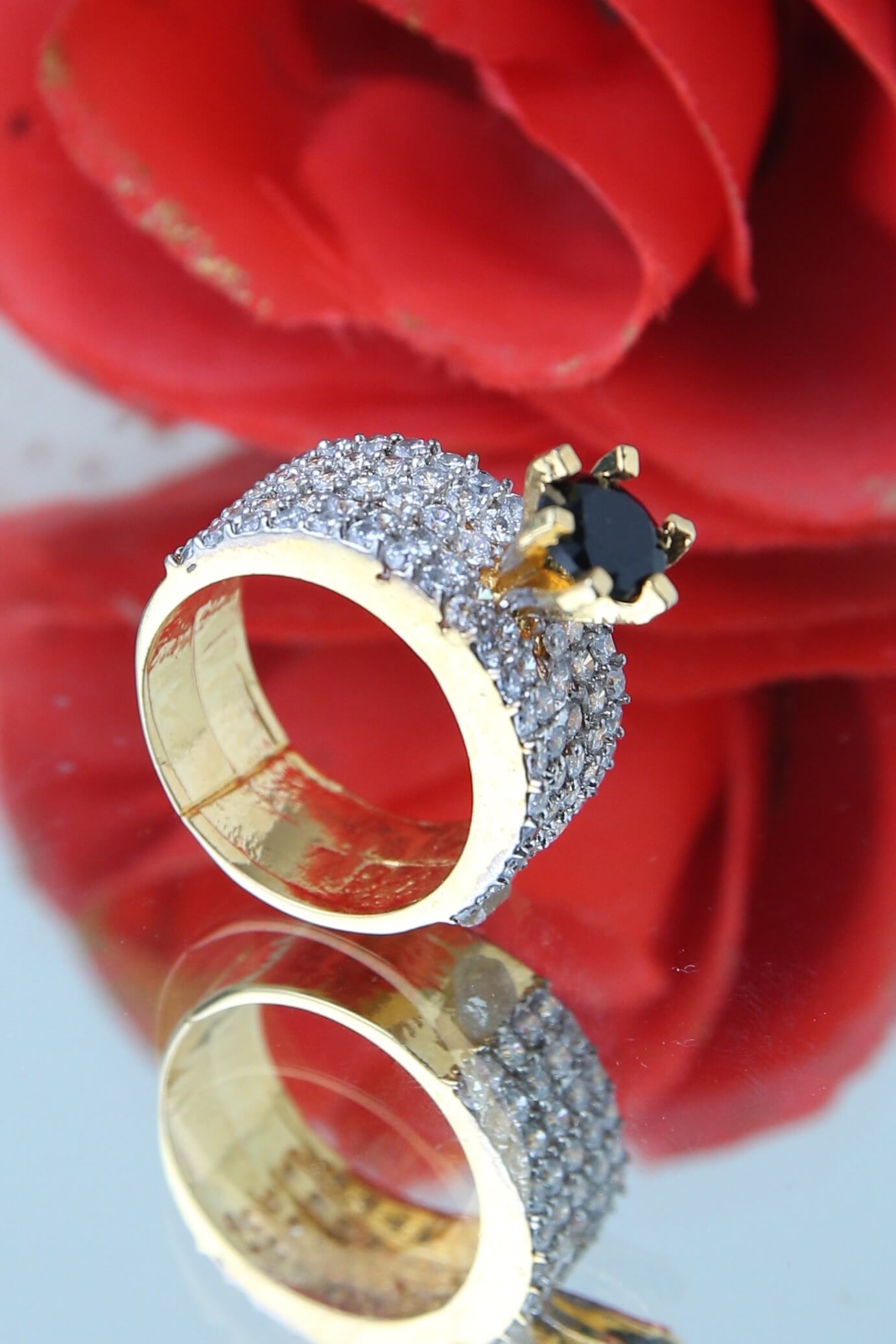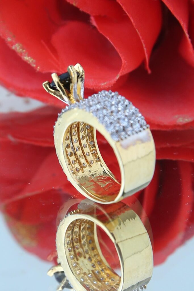 This gorgeous gold-plated ring adds a touch of sophistication and elegance with its dramatic black gemstone placed in a beautiful prong setting. Shining white stones adorn the band, which contrasts opulently with the black centerpiece. Its wide-band design adds to its grandeur, making it the ideal piece to make a statement at any event. The gold-plated band is designed for durability and comfort, offering a radiant shine that complements its intricate craftsmanship. The high-quality cubic zirconia stones ensure long-lasting brilliance, while the striking black gemstone makes a bold statement. Whether you’re looking for a unique gift, an anniversary ring, or a show-stopping cocktail ring, this piece is sure to impress.