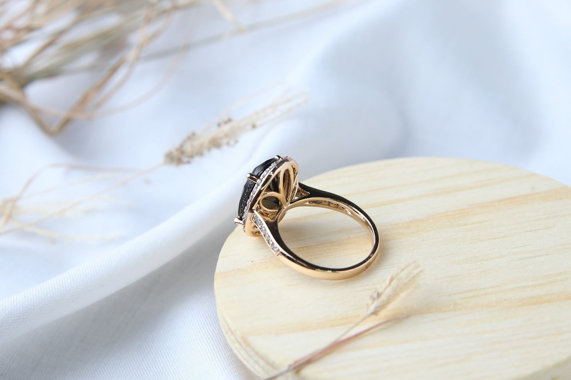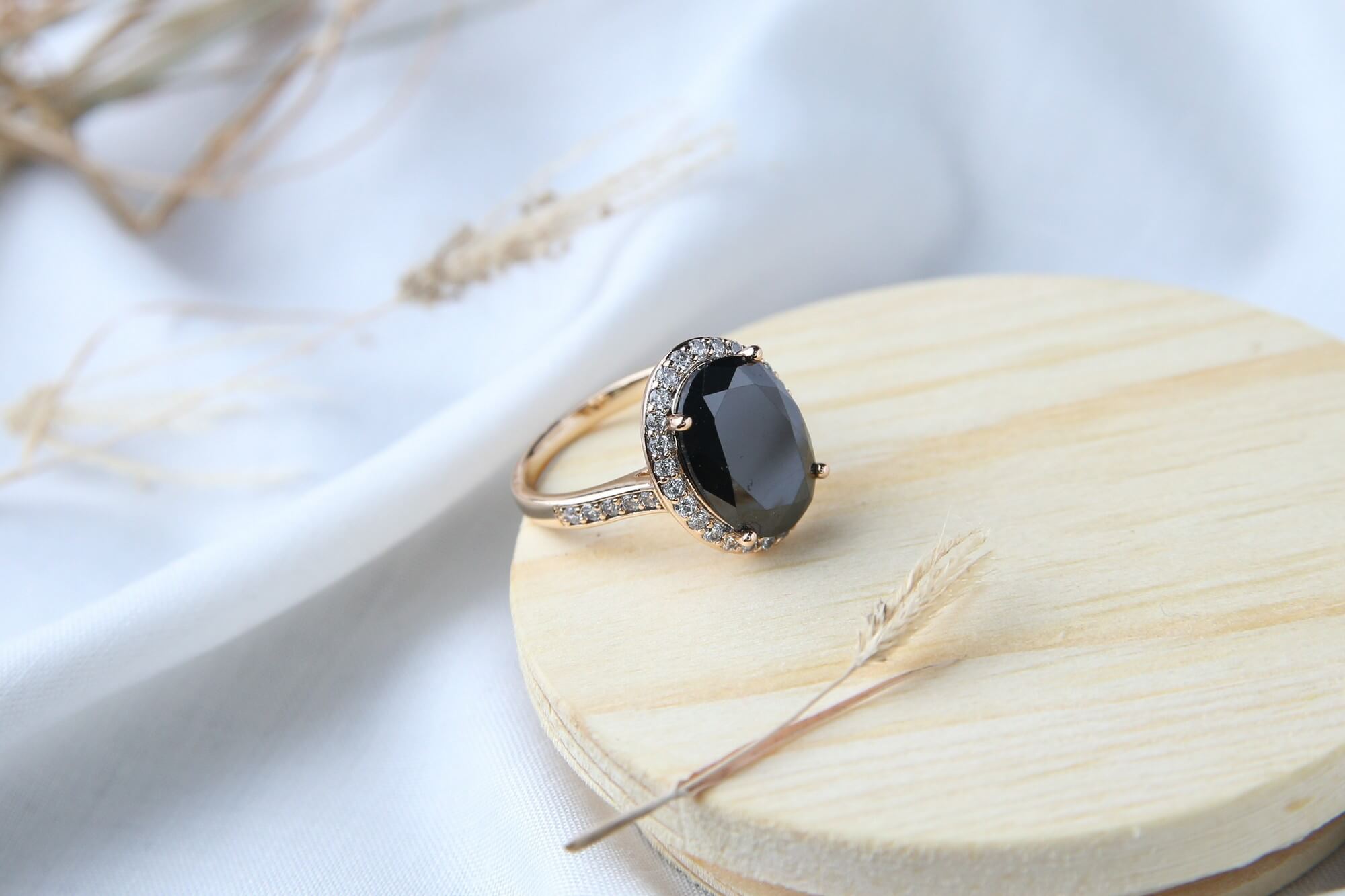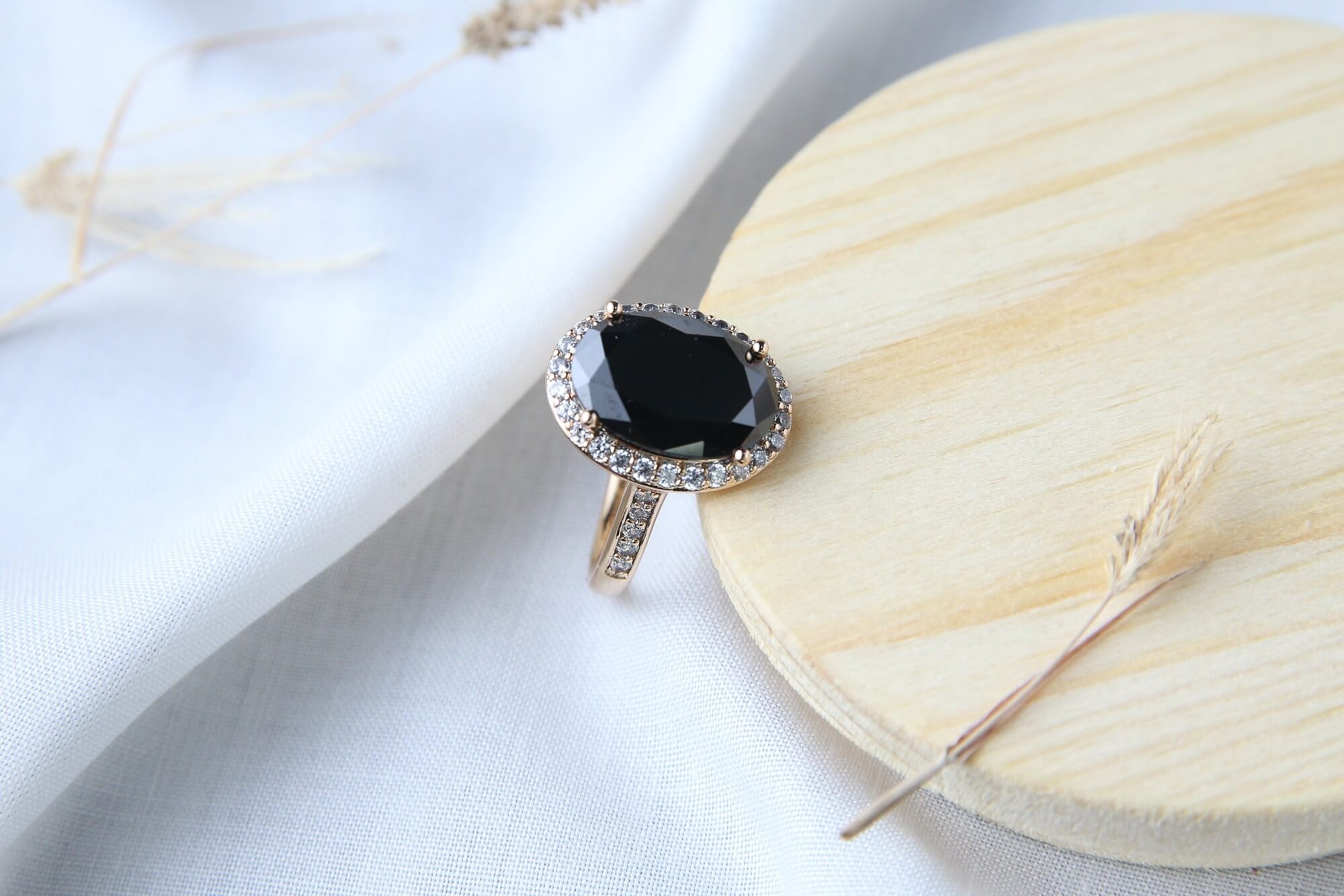 This timeless ring features a large oval black onyx gemstone encircled by a sparkling diamond halo. Set on a rose gold band with diamond accents, this piece balances dramatic contrast with refined elegance. The rich black stone creates a bold statement while the diamonds add luxurious sparkle and dimension.
