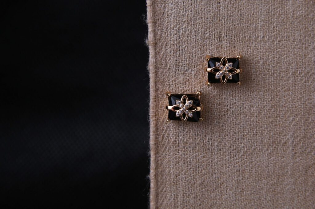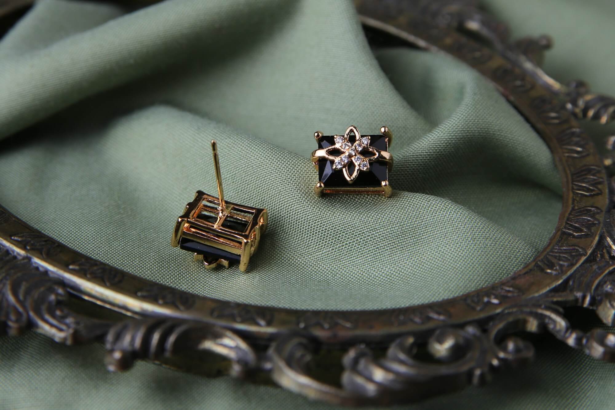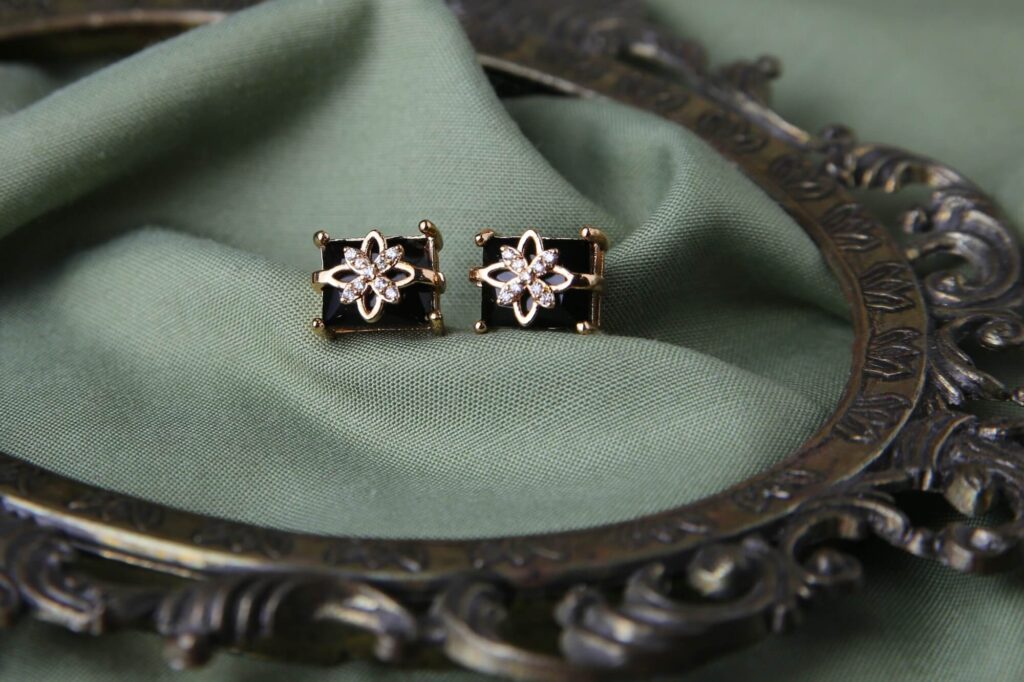 These gold-tone earrings feature black rectangular gemstones with flower designs crafted from small diamonds. The flower pattern has a starburst effect with pointed petals. The square shape of the black stone makes an incredible look. Perfect for both everyday wear and special events.
