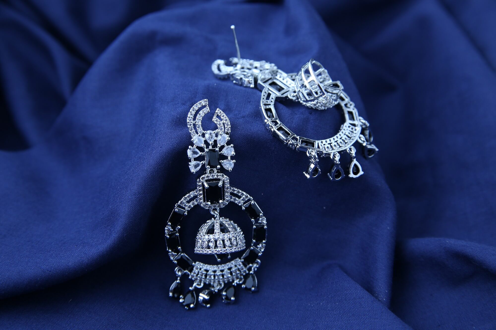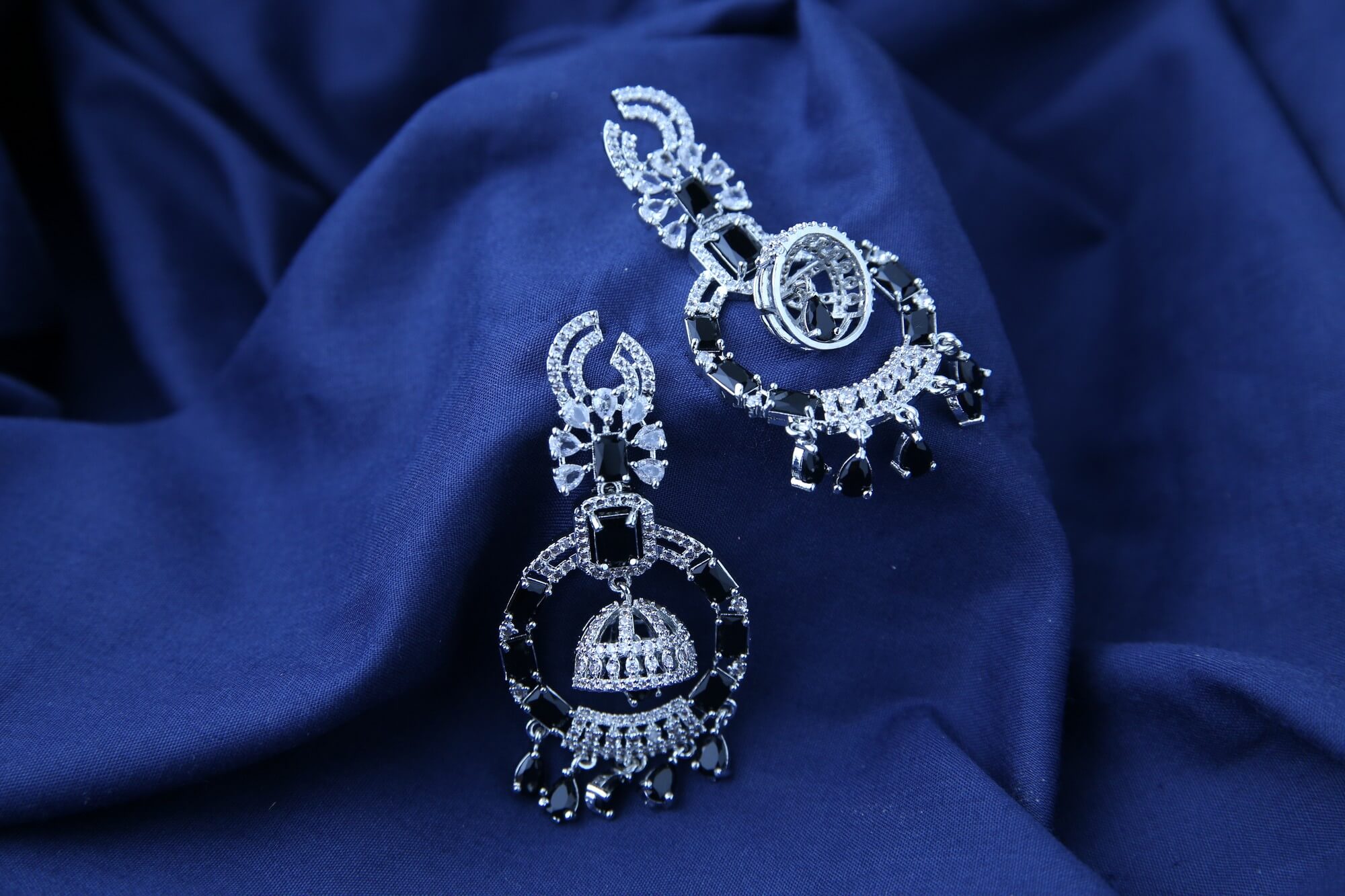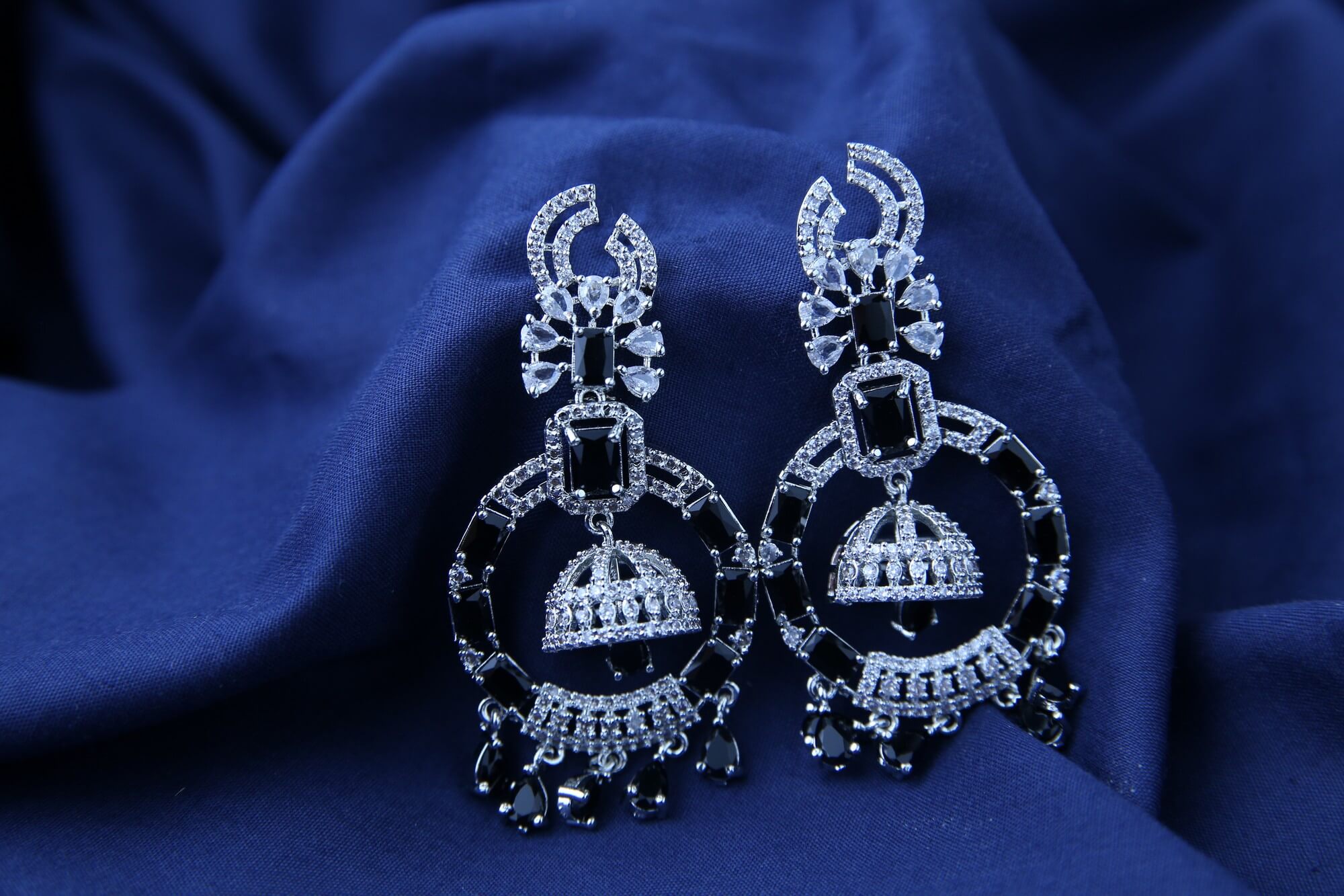 Command attention with these Midnight Majesty Chandeliers. These dramatic earrings feature a striking combination of sparkling clear crystals and deep black stones, creating a captivating contrast. The intricate design, with its layered elements and delicate details, evokes a sense of regal elegance. The chandelier style dangles gracefully, adding movement and drama to your look. Perfect for making a statement at any special occasion, these earrings exude sophistication and undeniable glamour.