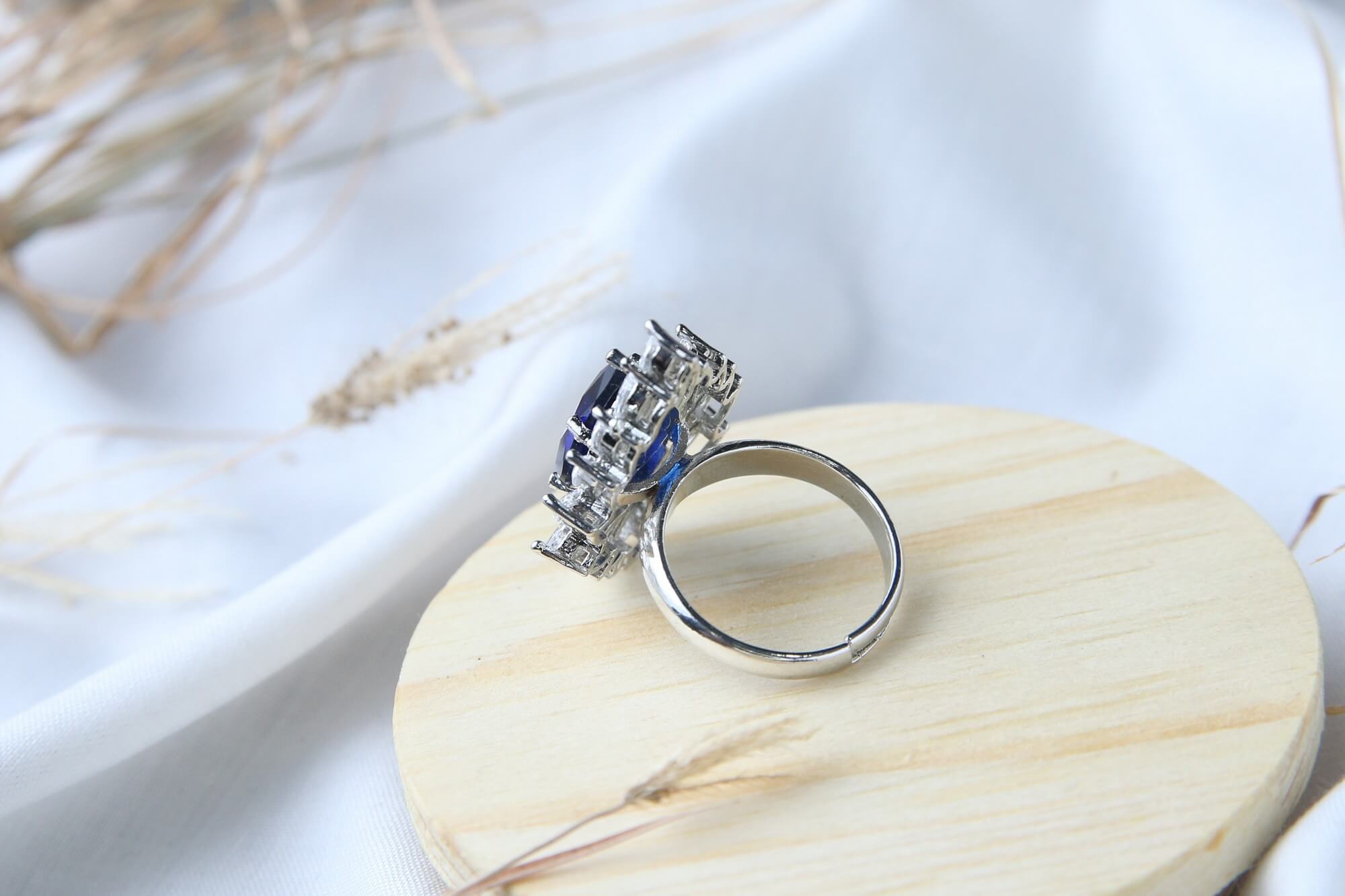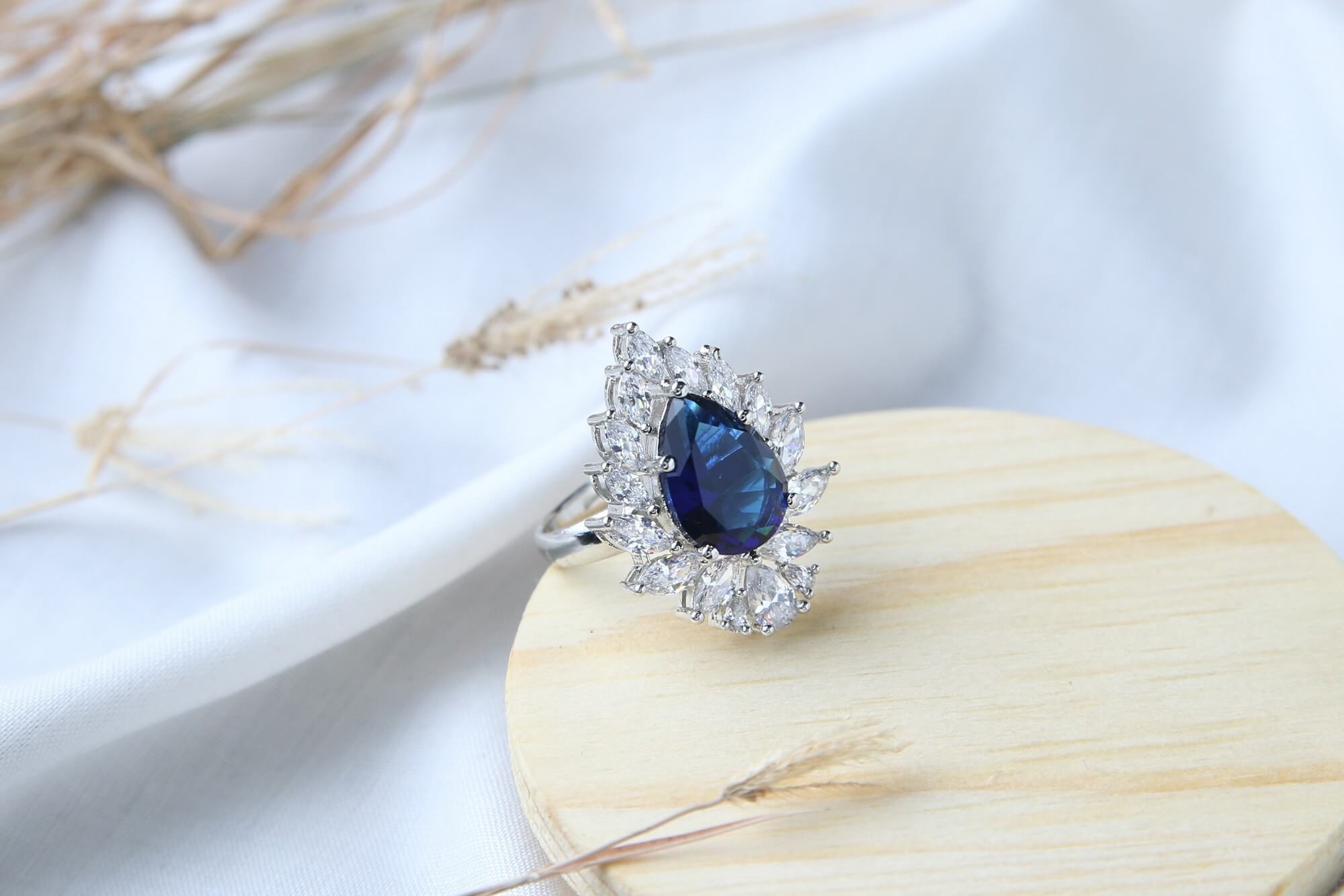 This exquisite ring features a stunning deep blue pear-shaped sapphire centerpiece surrounded by a dazzling halo of marquise-cut diamonds. The diamond-encrusted design creates an elegant sunburst effect that catches light from every angle, making this piece truly eye-catching. Perfect for special occasions or as a luxurious statement piece for everyday wear.