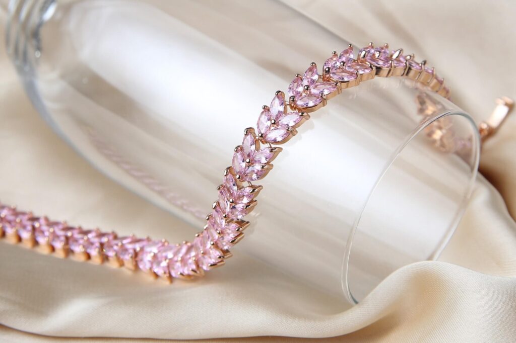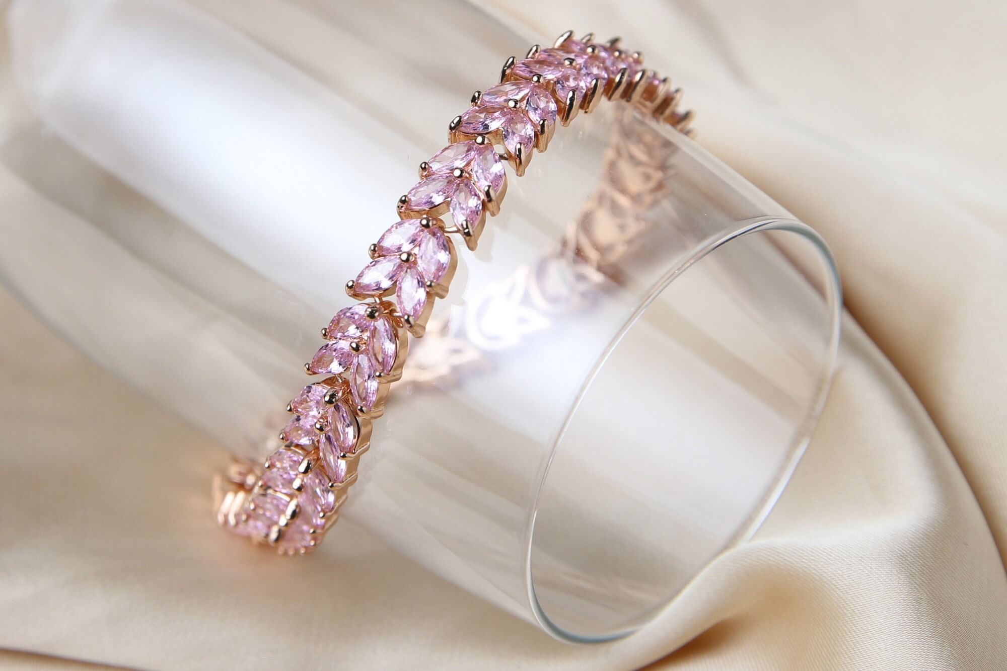 Add a touch of grace to your jewelry collection with the stunning Blush Bloom Bracelet. Featuring a delicate row of marquise-cut pink gemstones, this piece embodies elegance, charm, and timeless beauty. Designed to resemble blooming petals, each light-pink gemstone is carefully set in a luxurious rose-gold tone. The soft pastel hues and intricate arrangement make this bracelet a subtle yet captivating addition to any outfit. The Blush Bloom Bracelet is the perfect gift for a loved one or a charming indulgence for yourself.