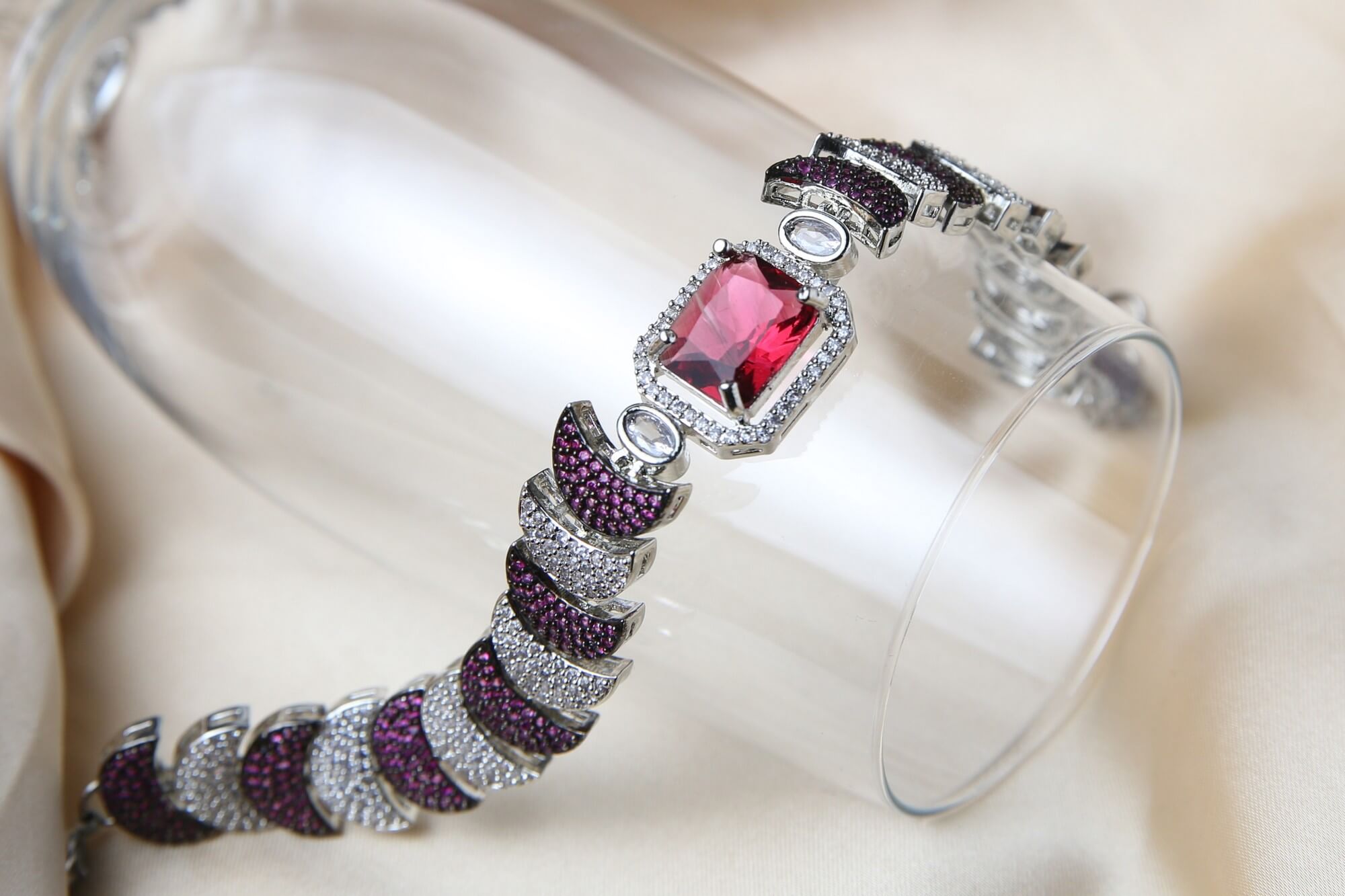 Make a statement with this striking bracelet, featuring a radiant ruby-red emerald-cut centerpiece surrounded by shimmering pavé diamonds. The intricate silver-tone design is accented with deep purple amethyst pavé links, creating a luxurious and bold contrast. Designed for elegance and durability, this bracelet is a perfect addition to evening wear or special occasions.