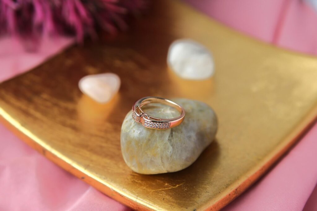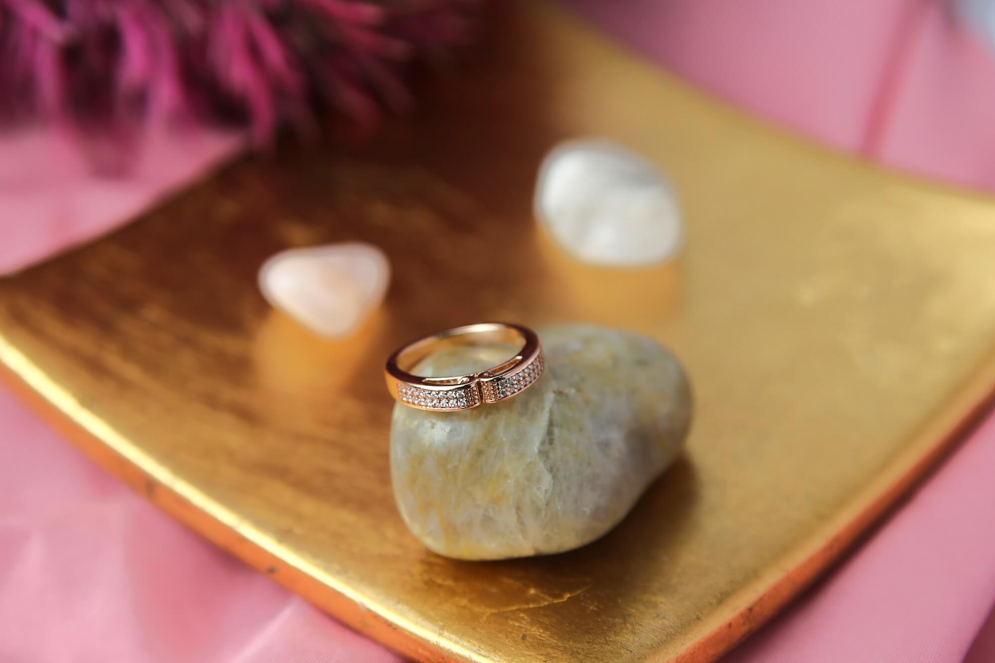 A tiny gold ring set with brilliant diamonds and fashioned like a bow. The ring is set against a gentle pink backdrop on a polished stone.