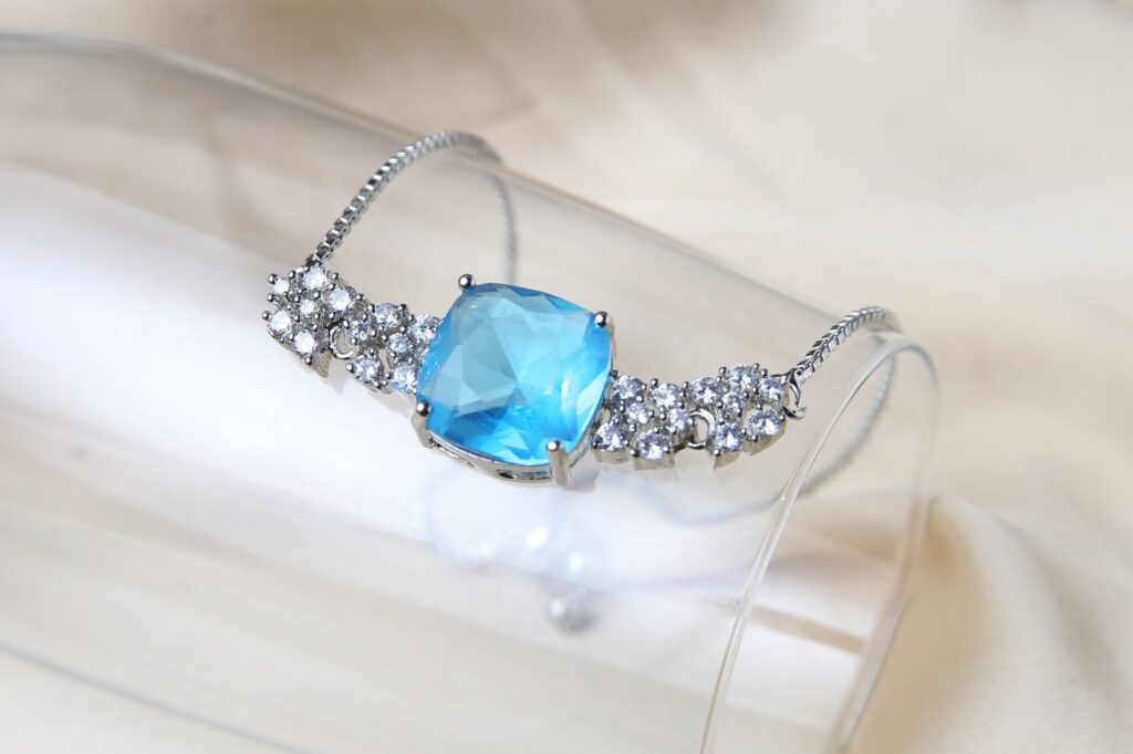 Elevate your outfit with this captivating silver-tone bracelet featuring a vibrant, cushion-cut sky-blue stone at its center. The rich, ruby-like hue of the stone adds a touch of bold elegance, making it a perfect statement piece for any occasion. The central stone is flanked by sparkling crystal accents, creating a dazzling contrast and enhancing the bracelet’s overall brilliance. More than just a beautiful piece of jewelry, this bracelet is a thoughtful gift that will be cherished. Consider gifting this radiant bracelet to a special one or treat yourself.