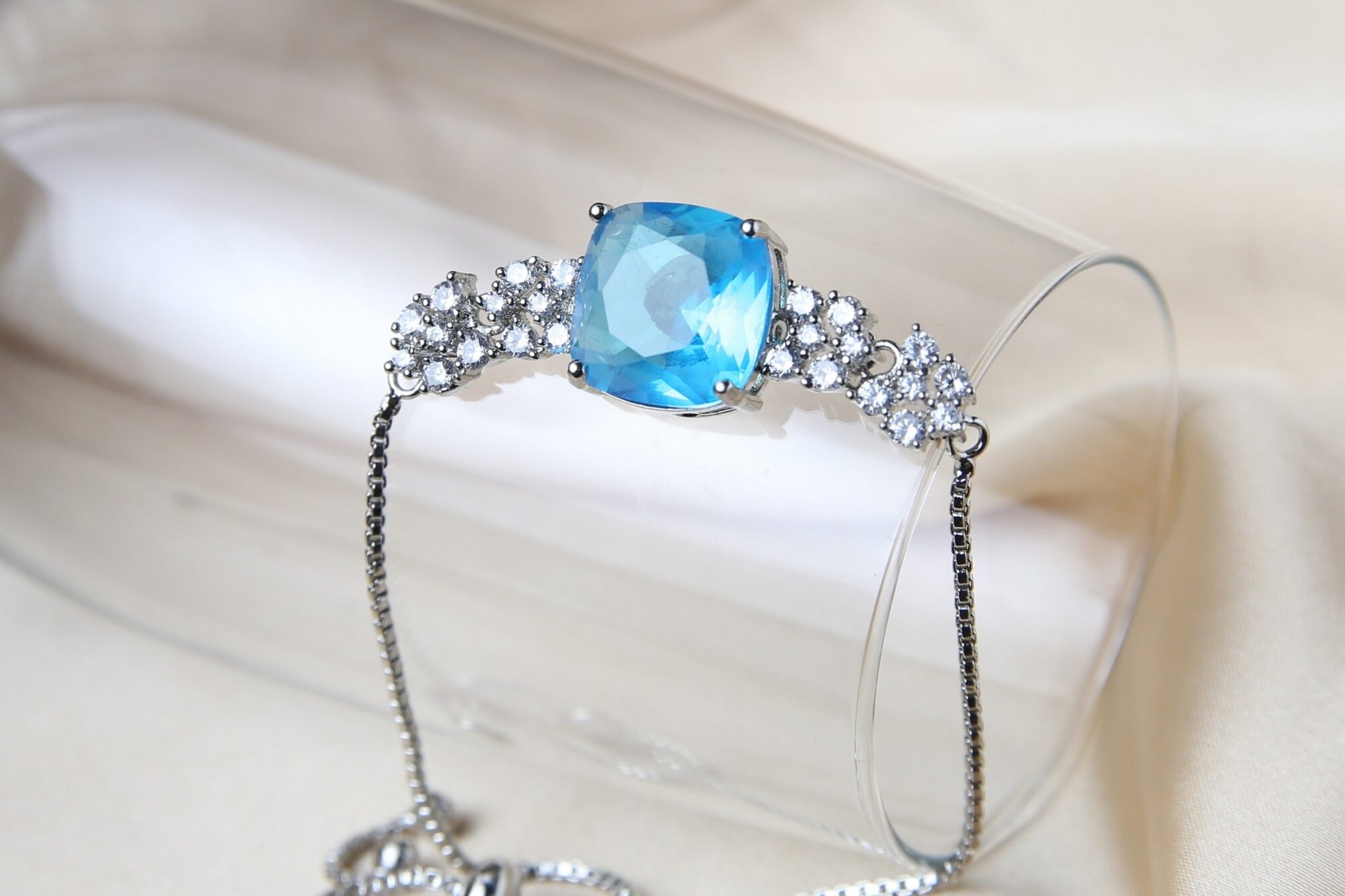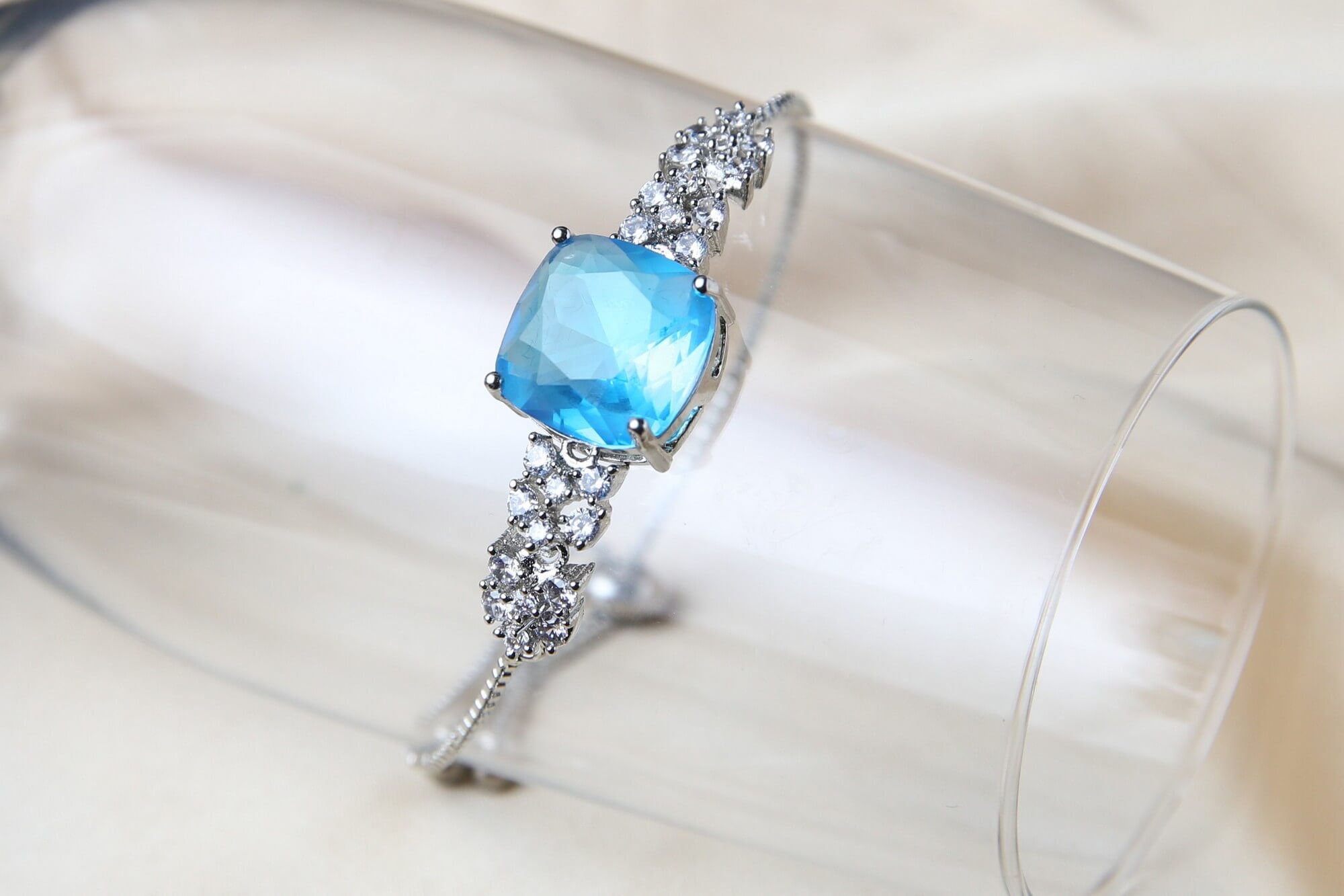 Elevate your outfit with this captivating silver-tone bracelet featuring a vibrant, cushion-cut sky-blue stone at its center. The rich, ruby-like hue of the stone adds a touch of bold elegance, making it a perfect statement piece for any occasion. The central stone is flanked by sparkling crystal accents, creating a dazzling contrast and enhancing the bracelet’s overall brilliance. More than just a beautiful piece of jewelry, this bracelet is a thoughtful gift that will be cherished. Consider gifting this radiant bracelet to a special one or treat yourself.