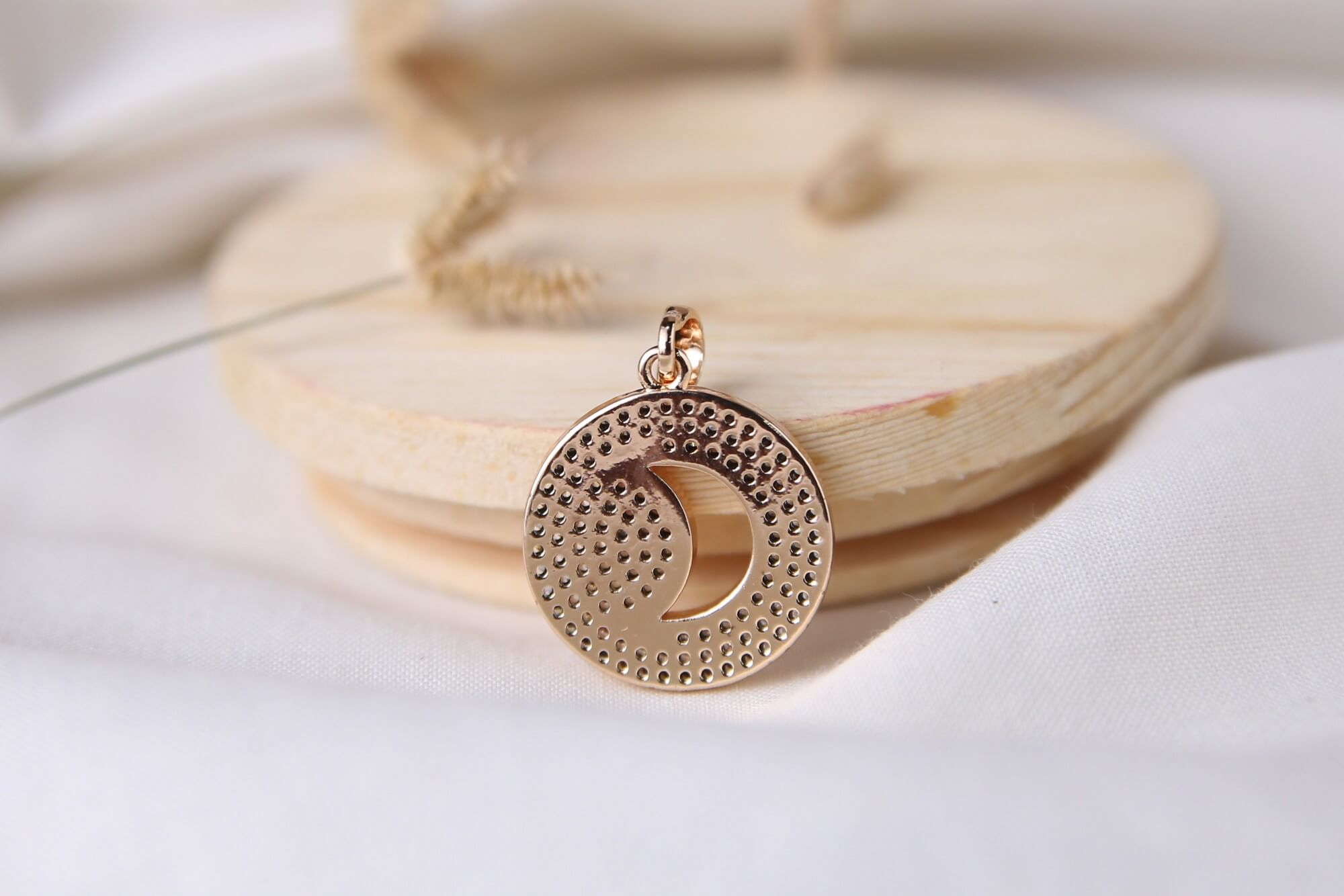 Capture the serene beauty with this stunning celestial medallion. This piece features a perfectly circular disc, with a shimmering carpet of brilliant cubic zirconia stones. At its heart lies a graceful, polished rose gold-tone crescent moon cutout, creating a striking contrast between the radiant pave surface. Crafted with a luxurious rose gold-tone finish, this pendant offers a modern yet mystical aesthetic. It is a perfect signature piece for those who find inspiration in the stars, adding a touch of celestial magic and sophisticated sparkle to any ensemble.