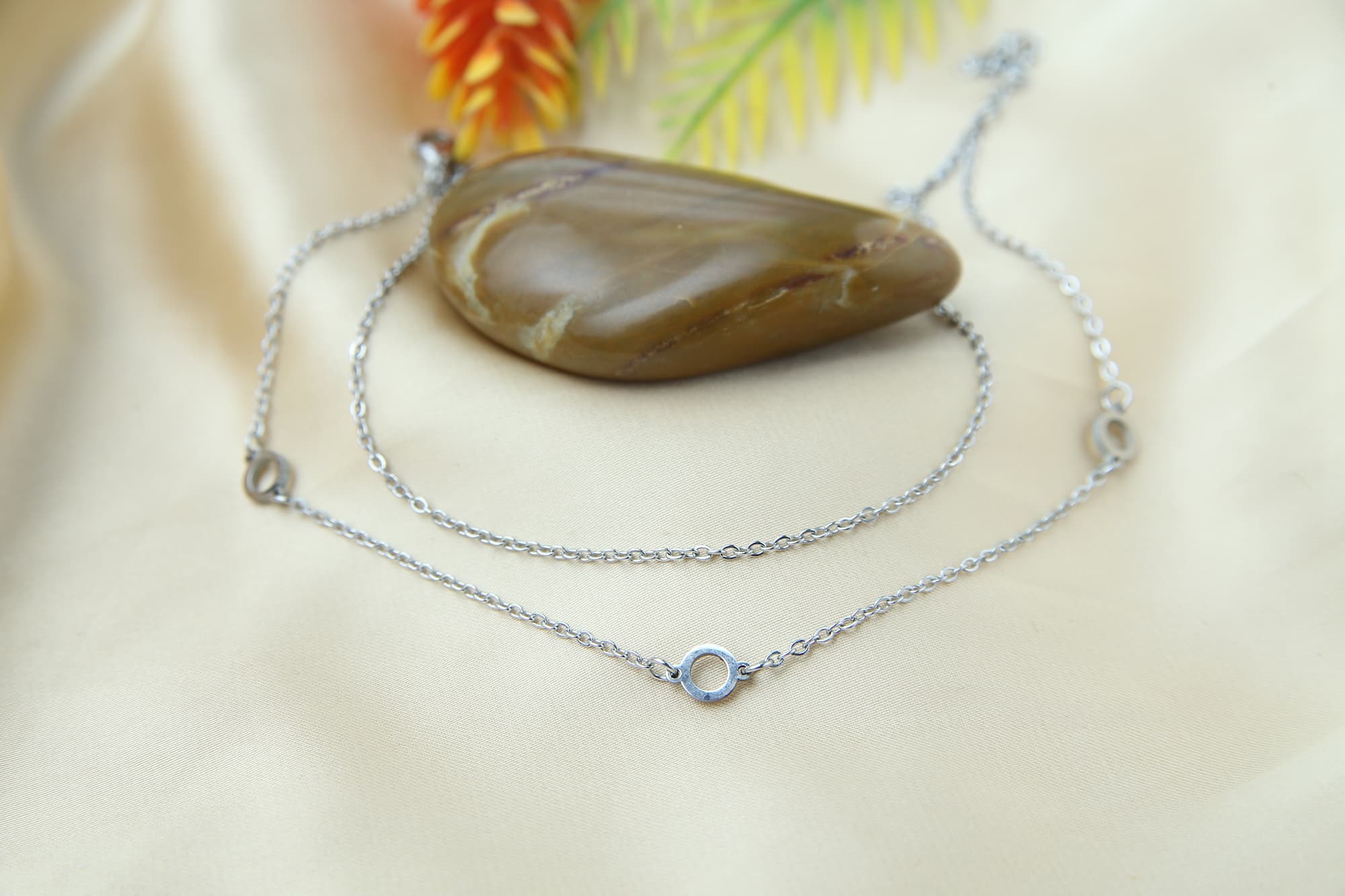 This minimalist anklet set features two delicate silver chains adorned with small circular pendants. The simple design of the pendants adds a touch of elegance without being overpowering. The anklet’s overall look is understated and feminine, making it a versatile accessory for any occasion.