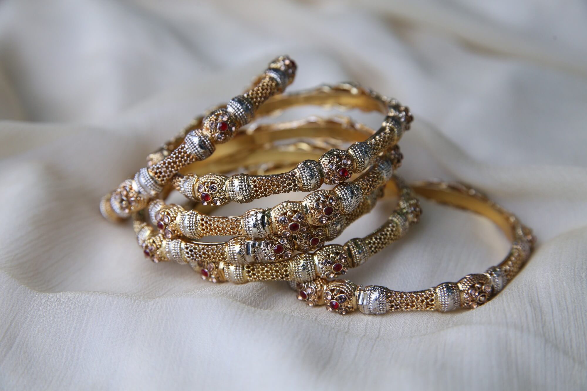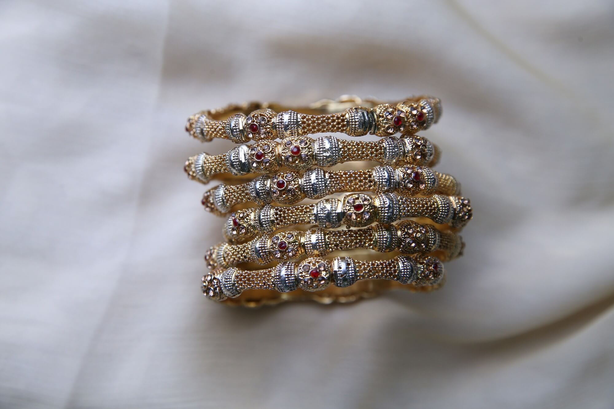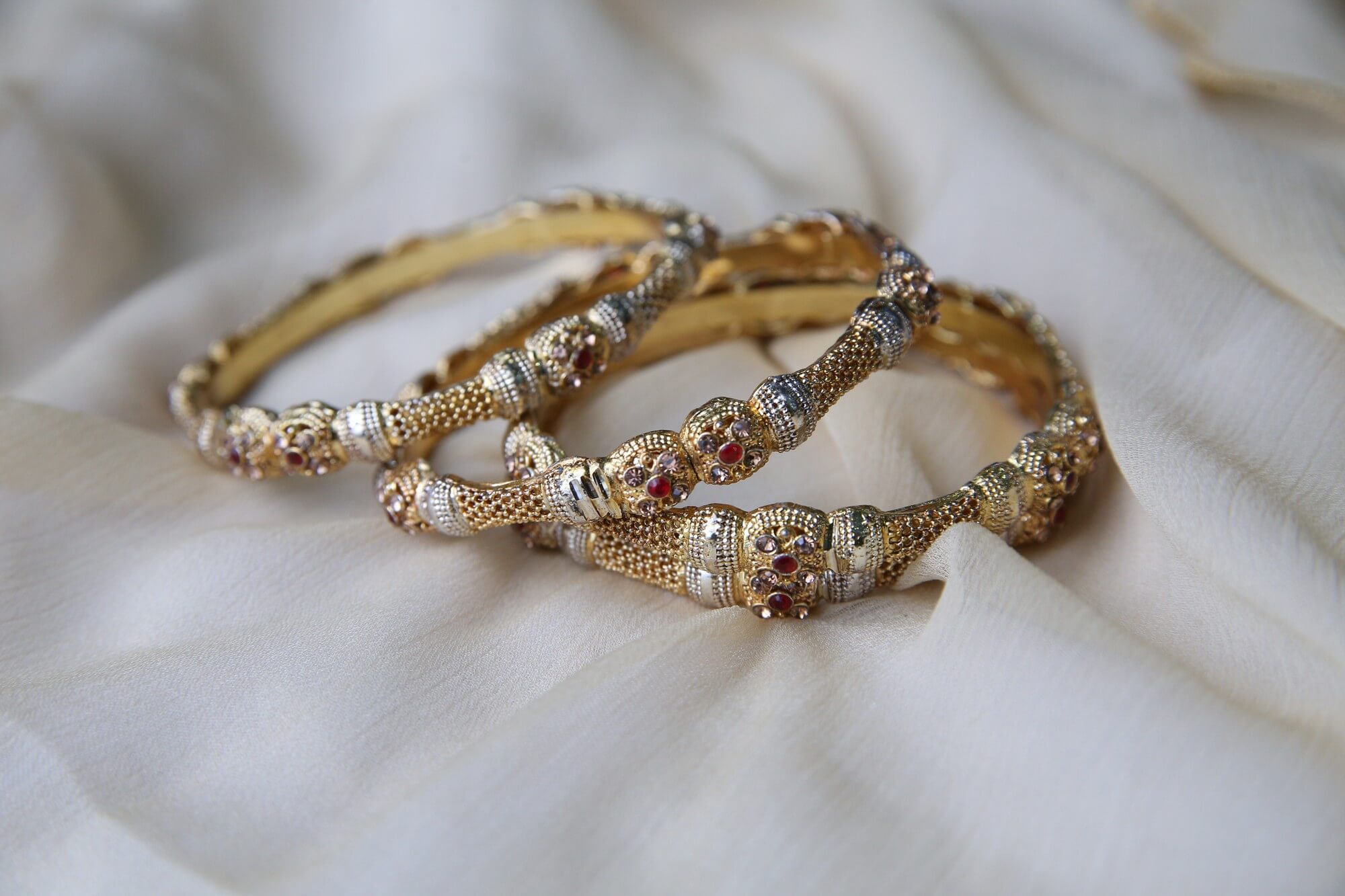 This set of classic gold bangles is exquisitely made with detailed design work. Every bangle has tiny decorative motifs embedded in it, combining contemporary craftsmanship with timeless beauty. The mix of gold and silver hues enhances the regal appearance, while the subtle accents of red gemstones add a touch of luxury. These bangles are perfect as a distinctive present to someone or for weddings and joyous occasions.