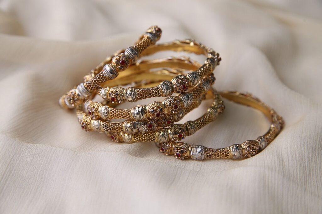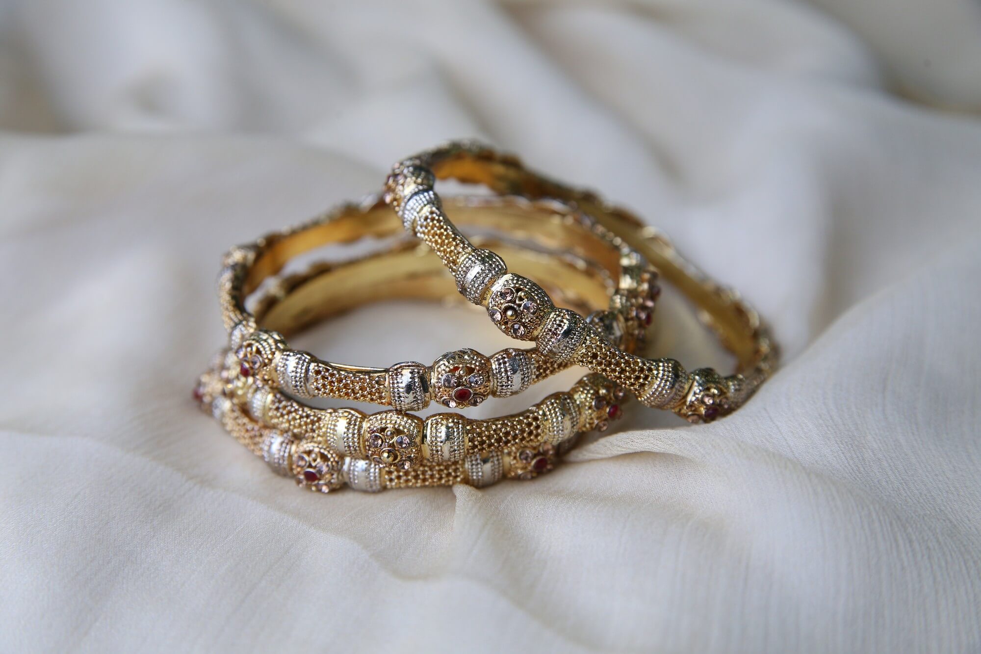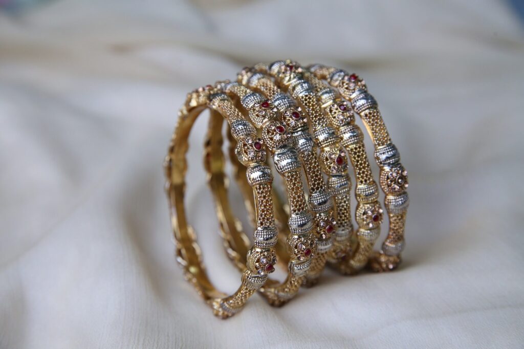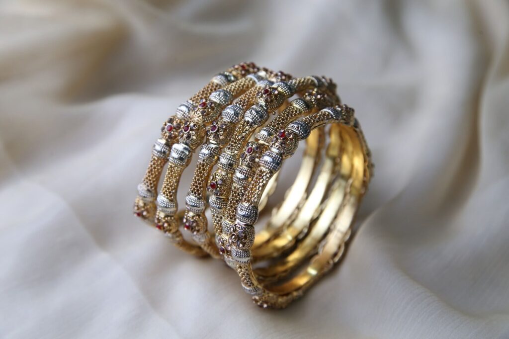 This set of classic gold bangles is exquisitely made with detailed design work. Every bangle has tiny decorative motifs embedded in it, combining contemporary craftsmanship with timeless beauty. The mix of gold and silver hues enhances the regal appearance, while the subtle accents of red gemstones add a touch of luxury. These bangles are perfect as a distinctive present to someone or for weddings and joyous occasions.