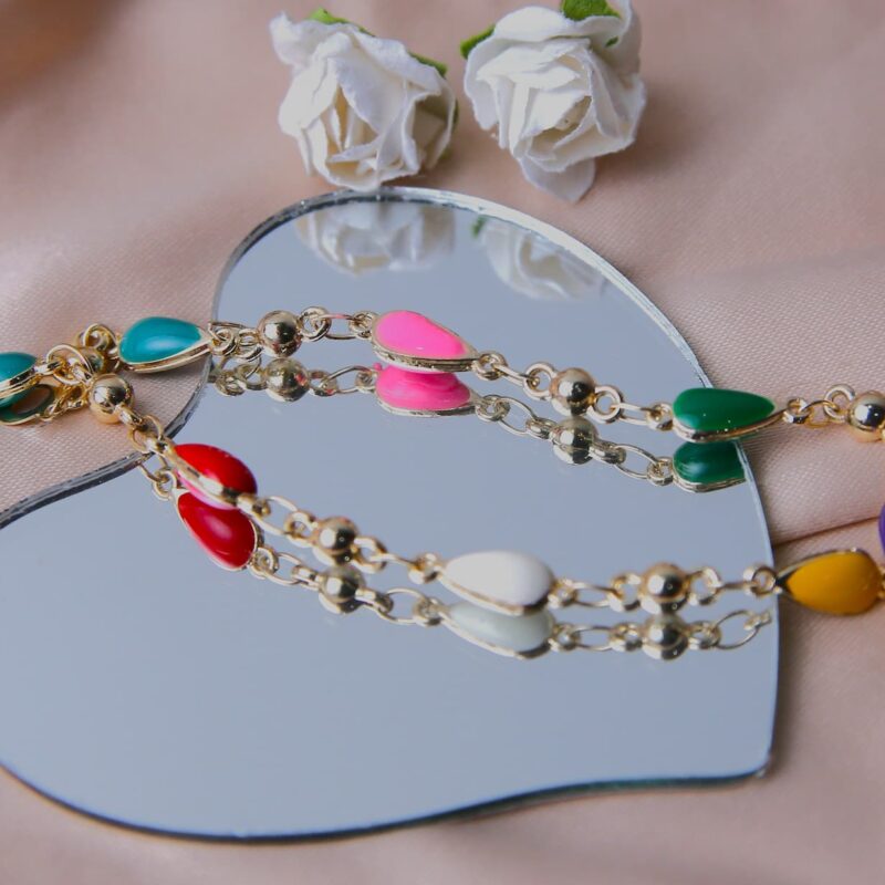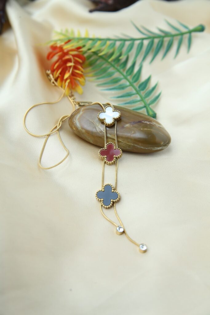 This elegant necklace features a gold chain adorned with three interlocking clover pendants. Each pendant is a different color – white, red, and blue – creating a striking and eye-catching design. A delicate chain with a crystal embellishment hangs from the bottom pendant, adding a touch of sparkle and sophistication.