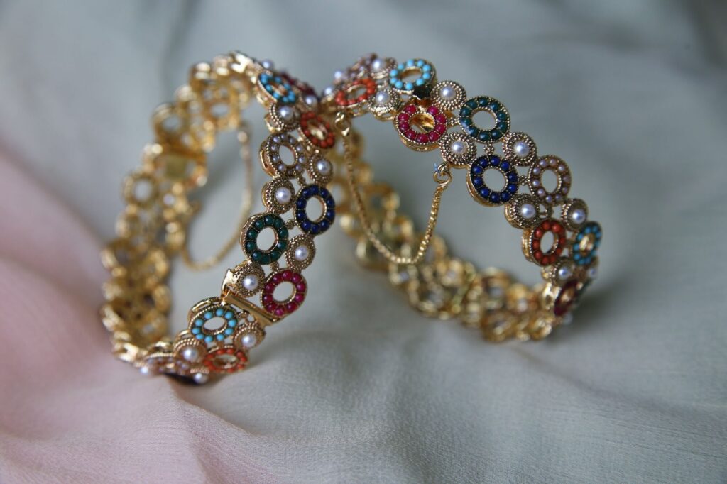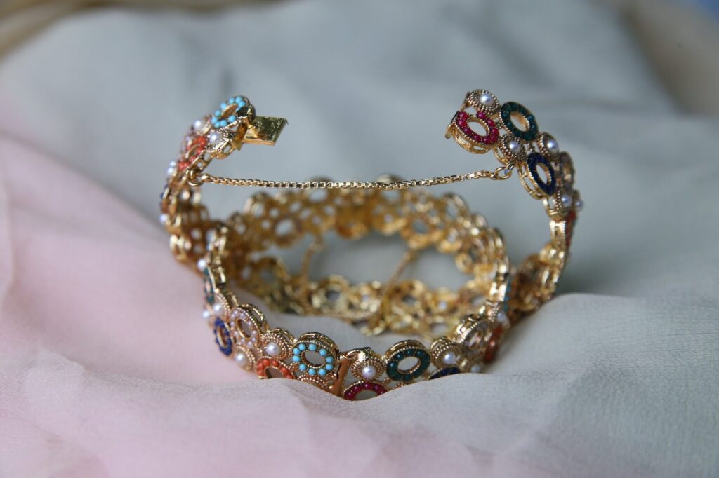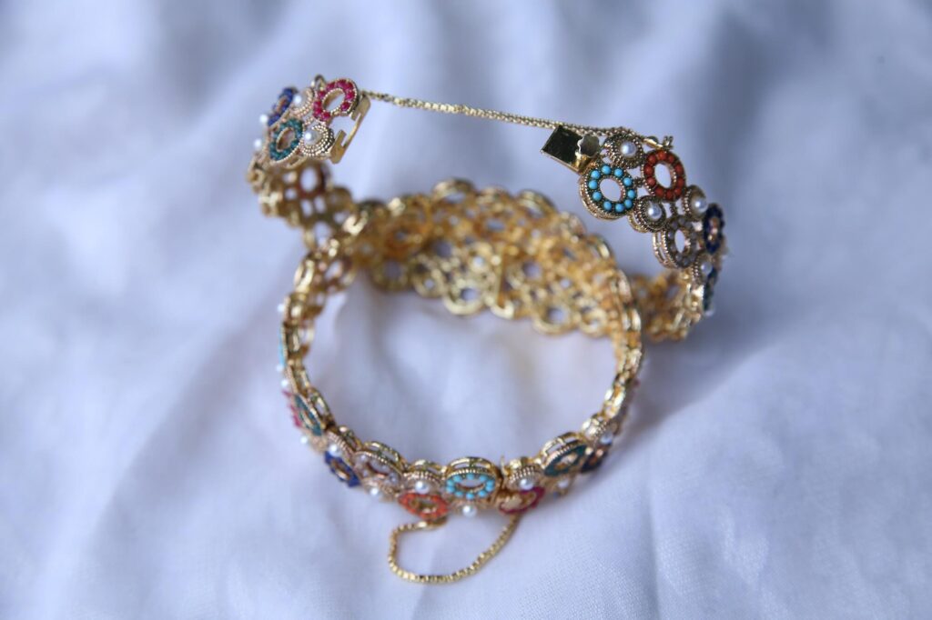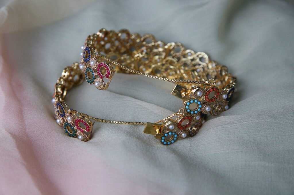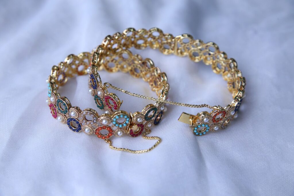 This eye-catching gold bracelet set is adorned with a variety of colorful gemstones and delicate pearls. It also features a chain extension for adjustable fitting, ensuring both comfort and security when worn. These bangles are ideal for any event because of the elegance added by the gold-toned metal. The bracelet has a traditional yet modern charm, ideal for weddings, festivals, or special events.