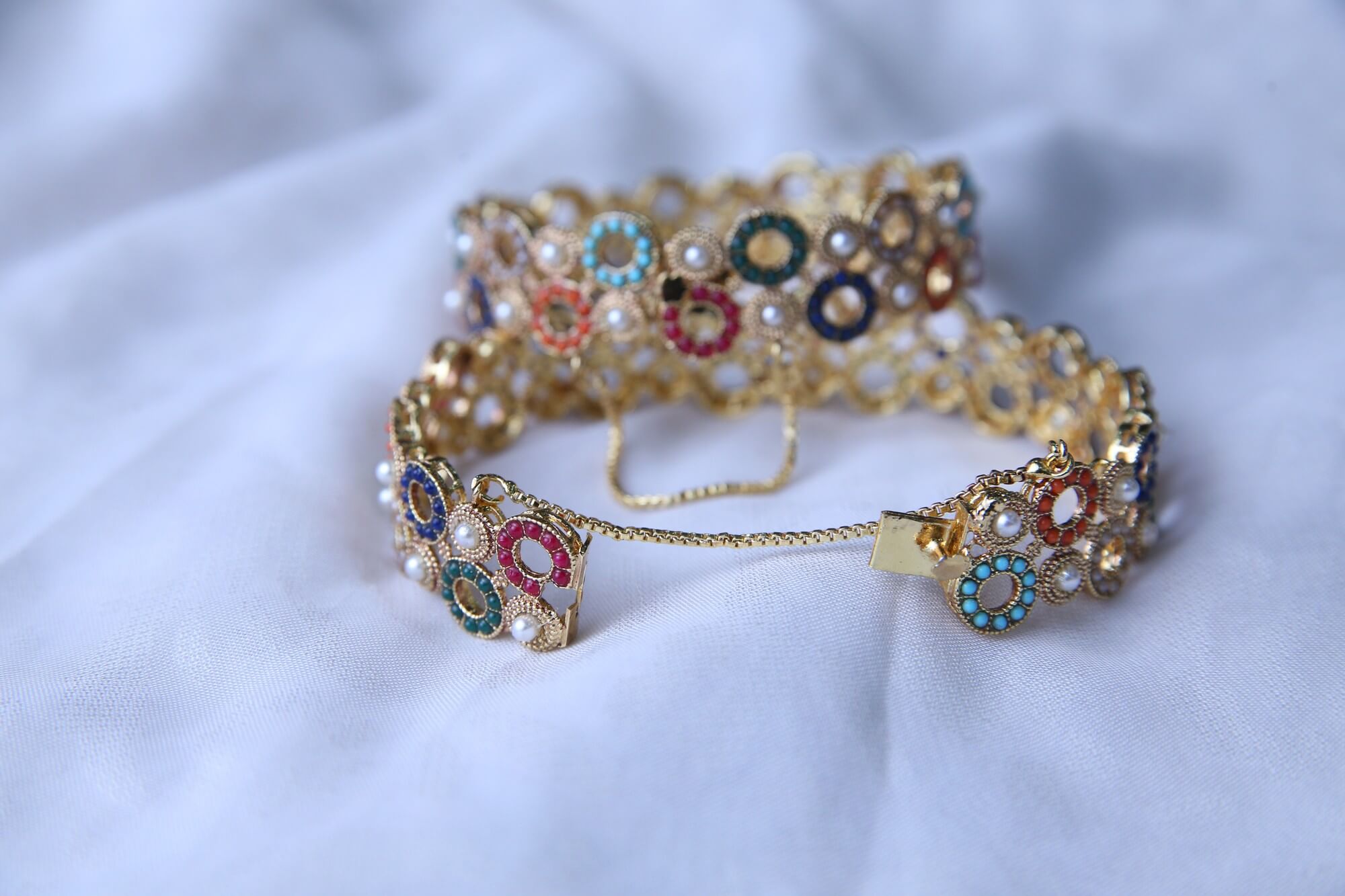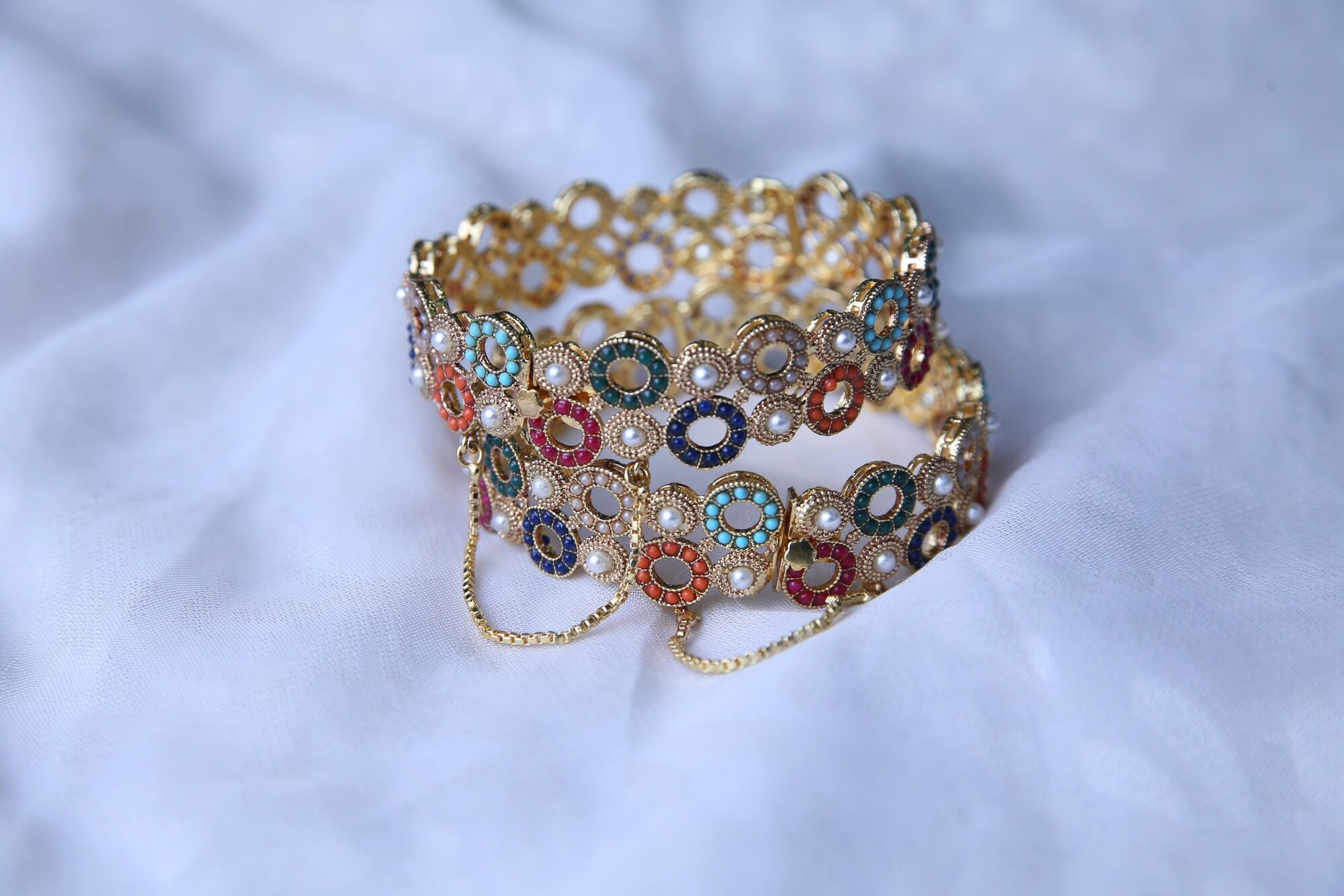 This eye-catching gold bracelet set is adorned with a variety of colorful gemstones and delicate pearls. It also features a chain extension for adjustable fitting, ensuring both comfort and security when worn. These bangles are ideal for any event because of the elegance added by the gold-toned metal. The bracelet has a traditional yet modern charm, ideal for weddings, festivals, or special events.