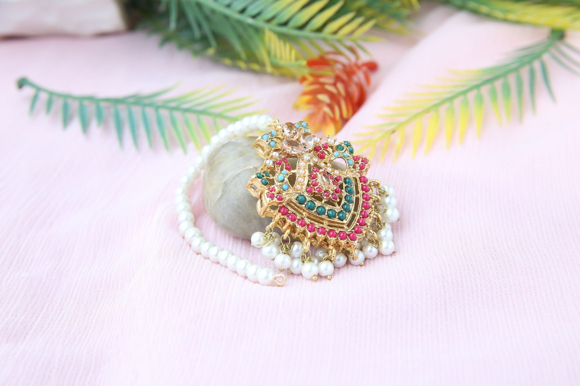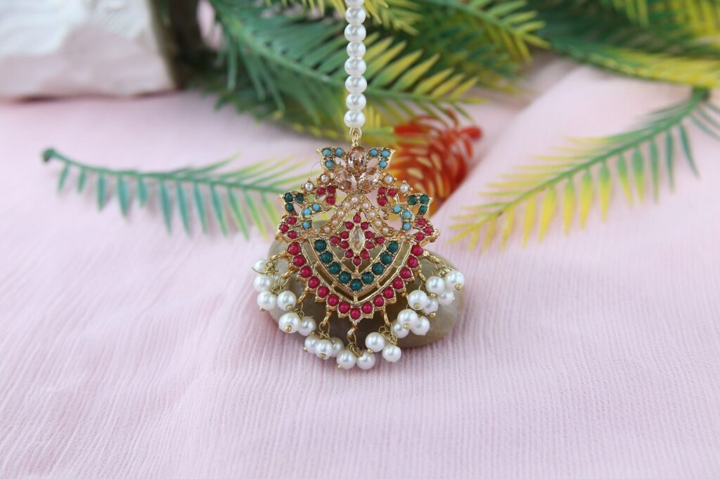 Timeless elegance is demonstrated by this gorgeous teeka. Its fascinating heart-shaped design, embellished with vivid green, pink, and turquoise gemstones, is crafted with delicate goldwork. The tiny pearls that hang down from the bottom give it a sophisticated, luminous look. The bindi is a real jewel of jewelry artistry because of its fine features and vibrant hues.