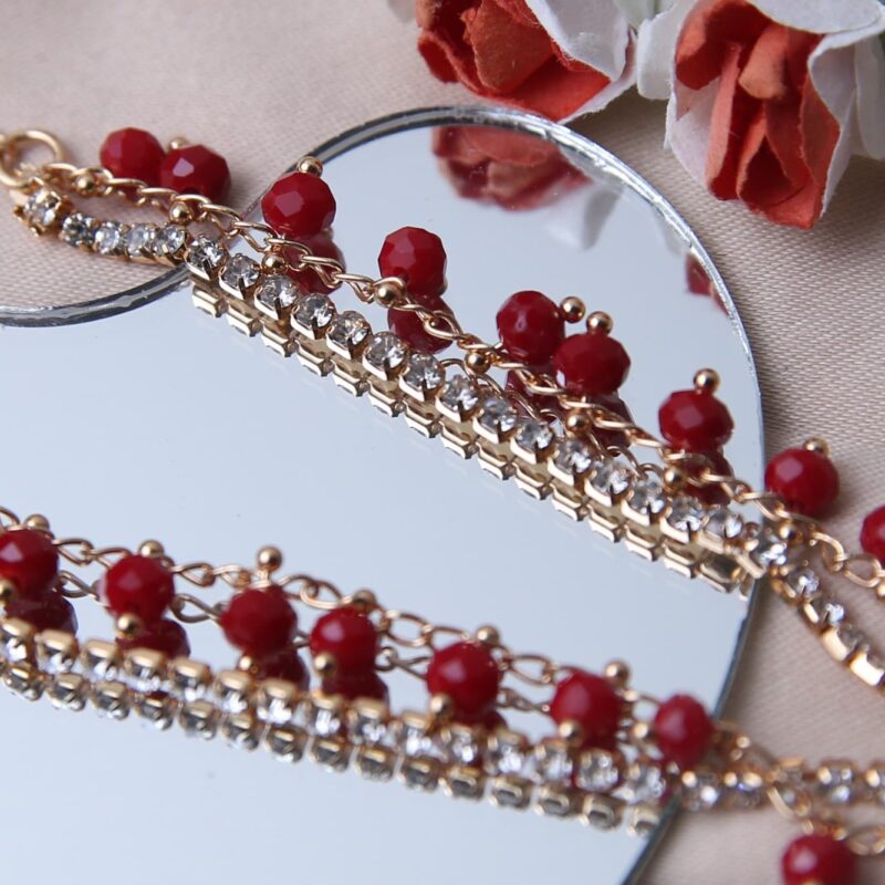 This picture features a stunning set of anklets with gold tones, vivid red beads, and little flower charms. Little daisy-shaped flowers with textural textures for a subtle contrast decorate the anklets. Bright red beads are strewn throughout the blooms, bringing a flash of color that accentuates the design’s overall charm and elegance. To complete the romantic and feminine look, the anklets are placed on a heart-shaped mirror with delicate red and white flowers in the background.