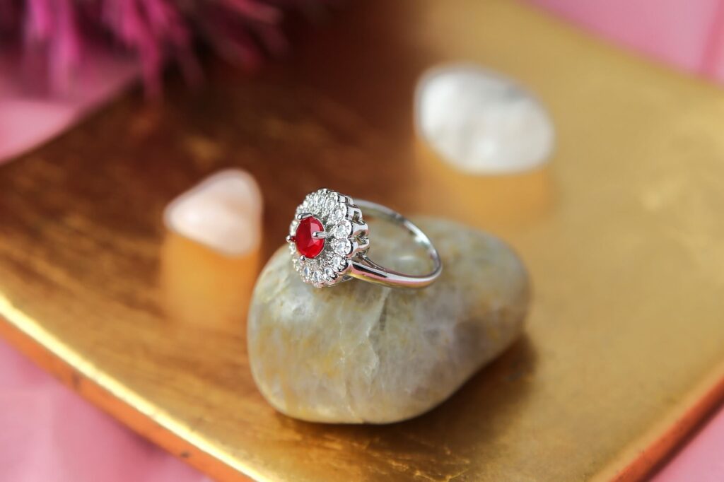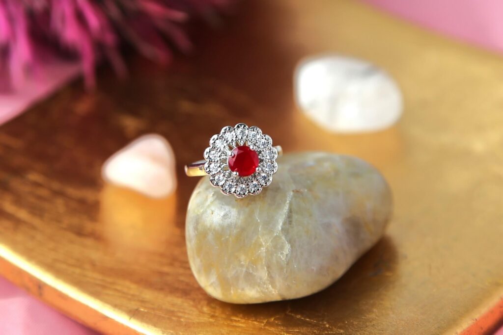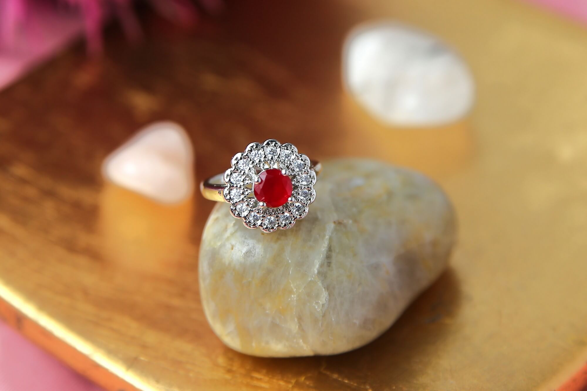 A delicate halo of glittering diamonds encircles the stunning red ruby at the core of this magnificent ring. The vivid scarlet and the sparkling white stones provide a striking contrast that makes a flower in bloom come to mind. The ring, which is set on a polished gold band, is the ideal accessory for any special occasion because it emanates elegance and charm.
