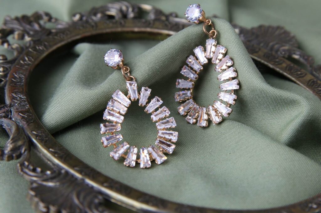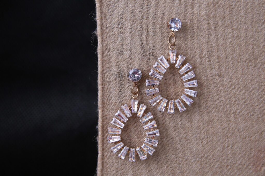 These dazzling statement earrings feature baguette-cut crystals arranged in an elegant teardrop silhouette. Beginning with a brilliant round stone stud, each earring showcases perfectly aligned rectangular crystals creating a horseshoe shape that frames the face beautifully. The gold setting enhances the brilliance of each precisely placed crystal, maximizing light reflection and sparkle. These show-stopping pieces create dramatic movement and catch light with every turn of the head. Ideal for evening events and celebrations where exceptional elegance is desired.