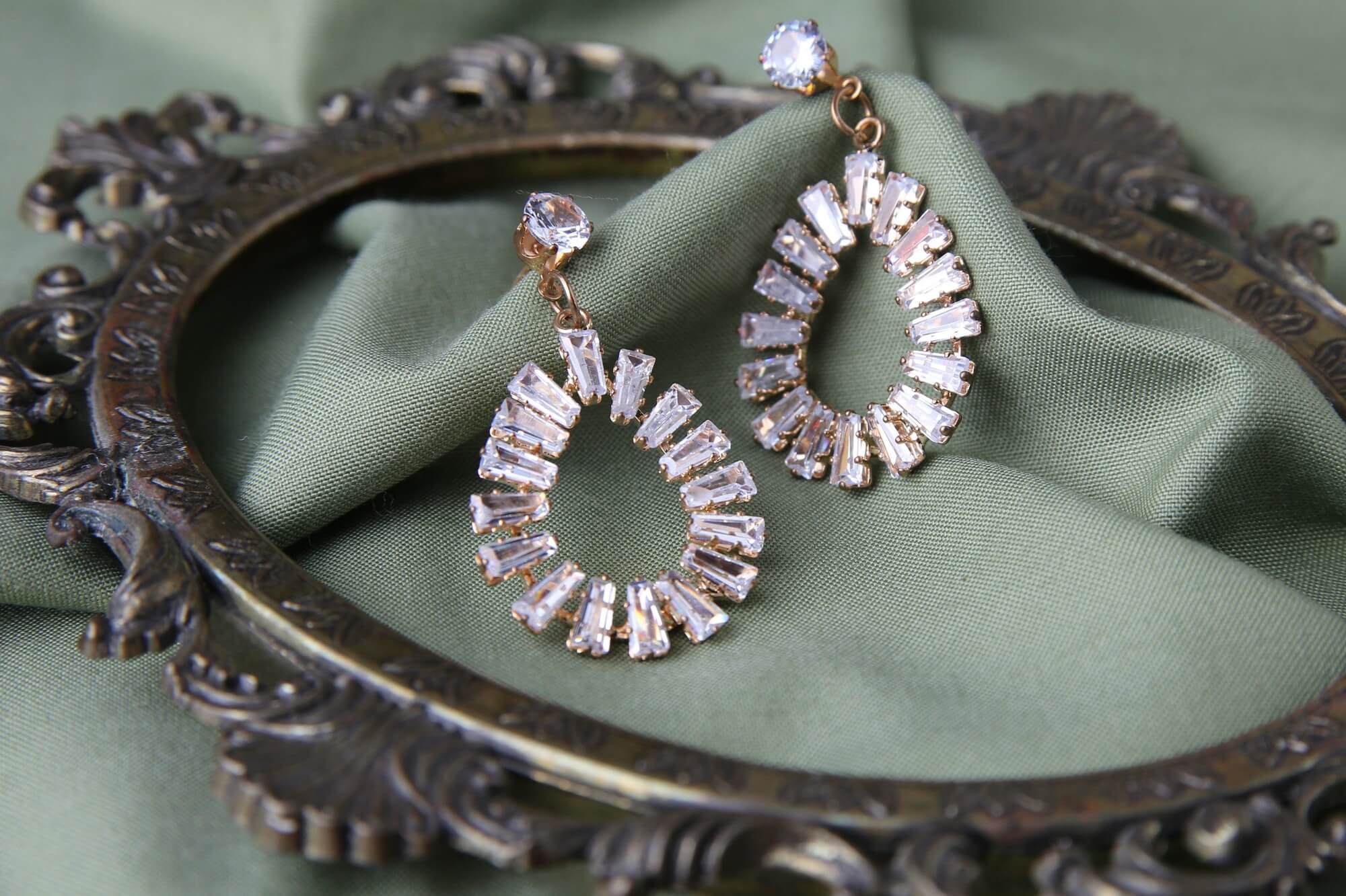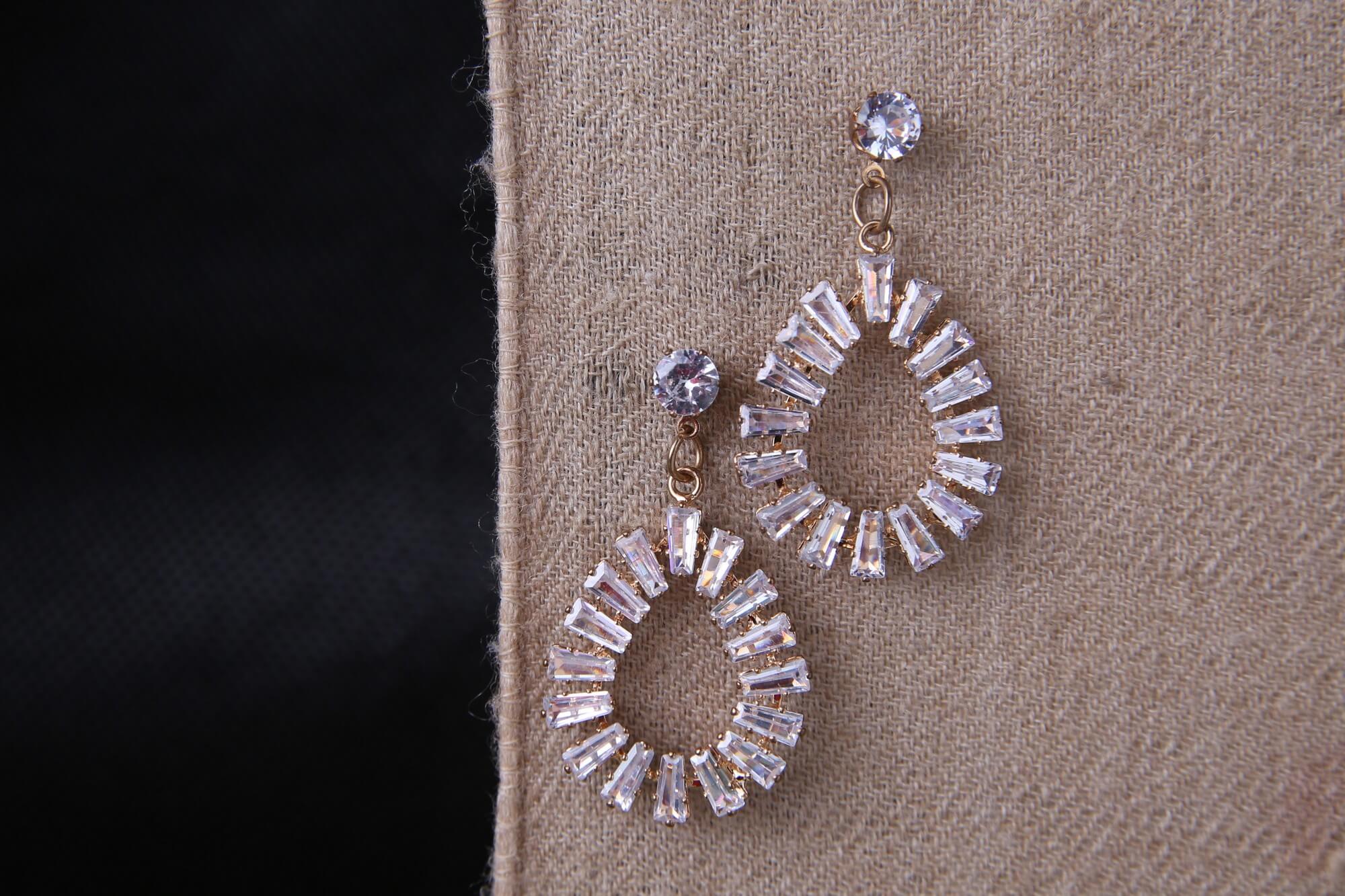 These dazzling statement earrings feature baguette-cut crystals arranged in an elegant teardrop silhouette. Beginning with a brilliant round stone stud, each earring showcases perfectly aligned rectangular crystals creating a horseshoe shape that frames the face beautifully. The gold setting enhances the brilliance of each precisely placed crystal, maximizing light reflection and sparkle. These show-stopping pieces create dramatic movement and catch light with every turn of the head. Ideal for evening events and celebrations where exceptional elegance is desired.