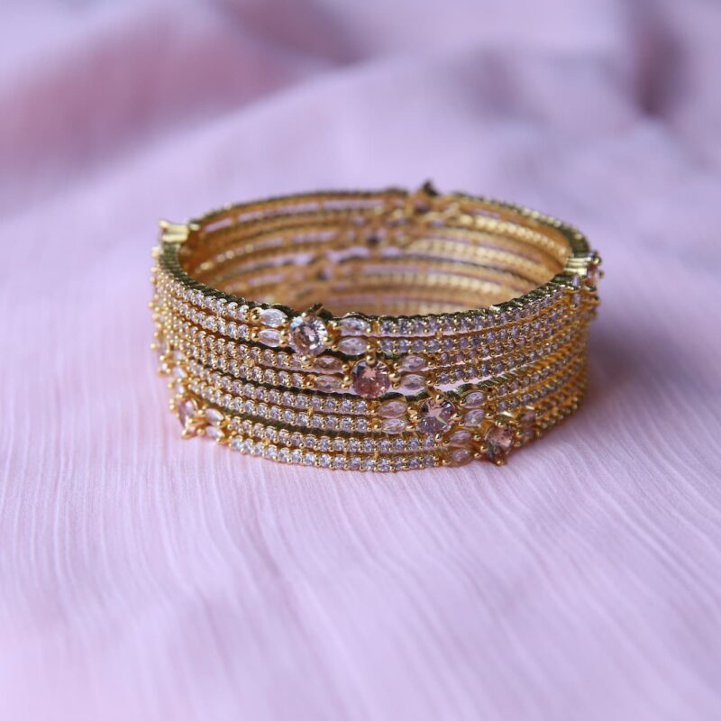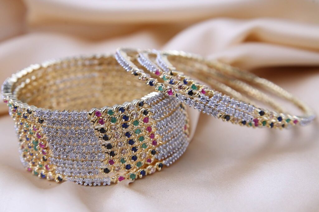 Elevate your style with this exquisite set of 12 bangles. Each bangle is meticulously crafted with a radiant gold-toned finish, lavishly adorned with dazzling clear cubic zirconia stones. The set includes a variety of designs, featuring both wide and slender bangles, some with colorful accents of green, red, and blue stones. This versatile collection allows you to mix and match, creating a personalized and glamorous look for any occasion.