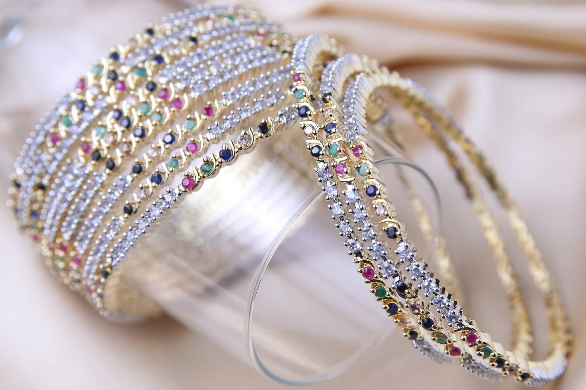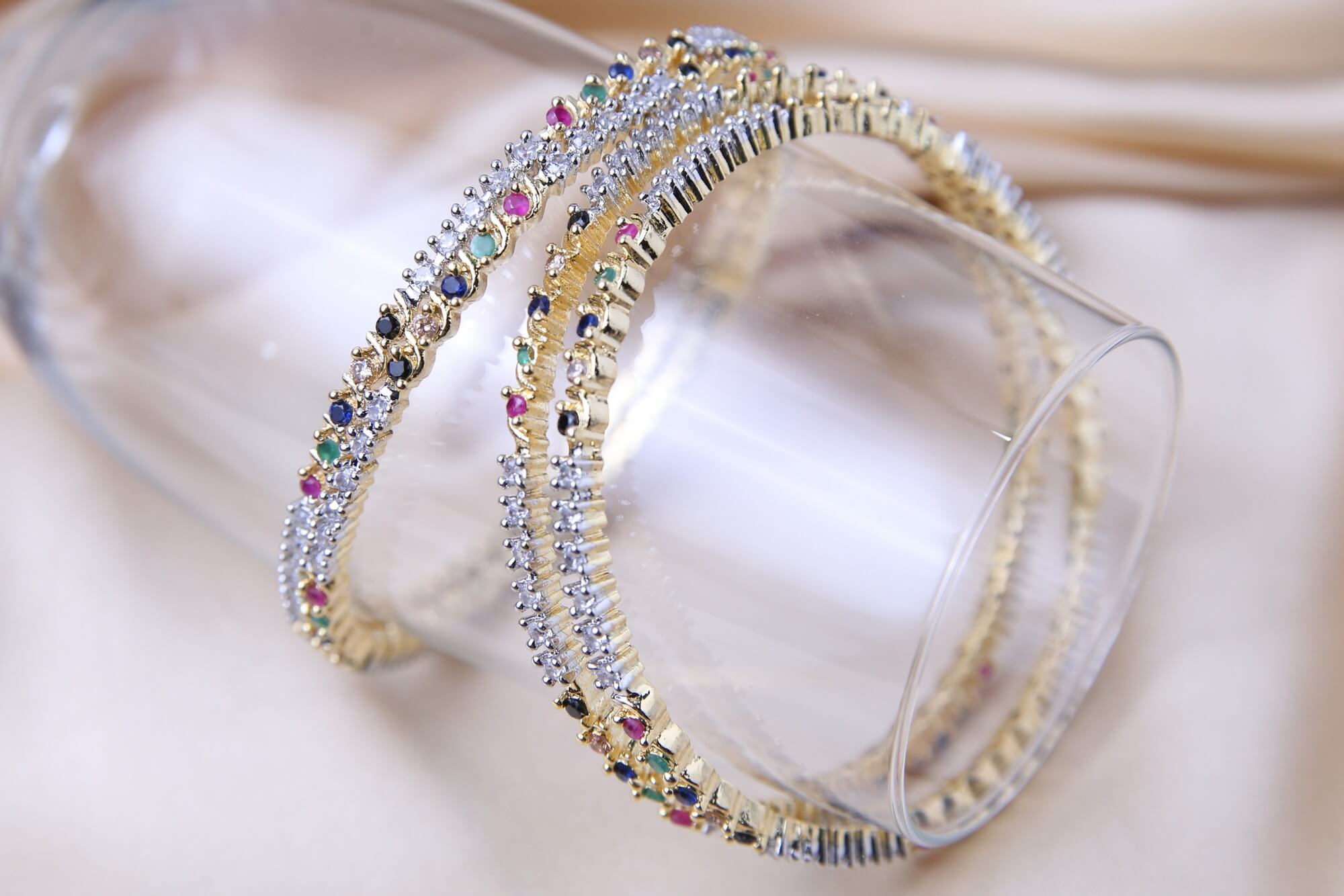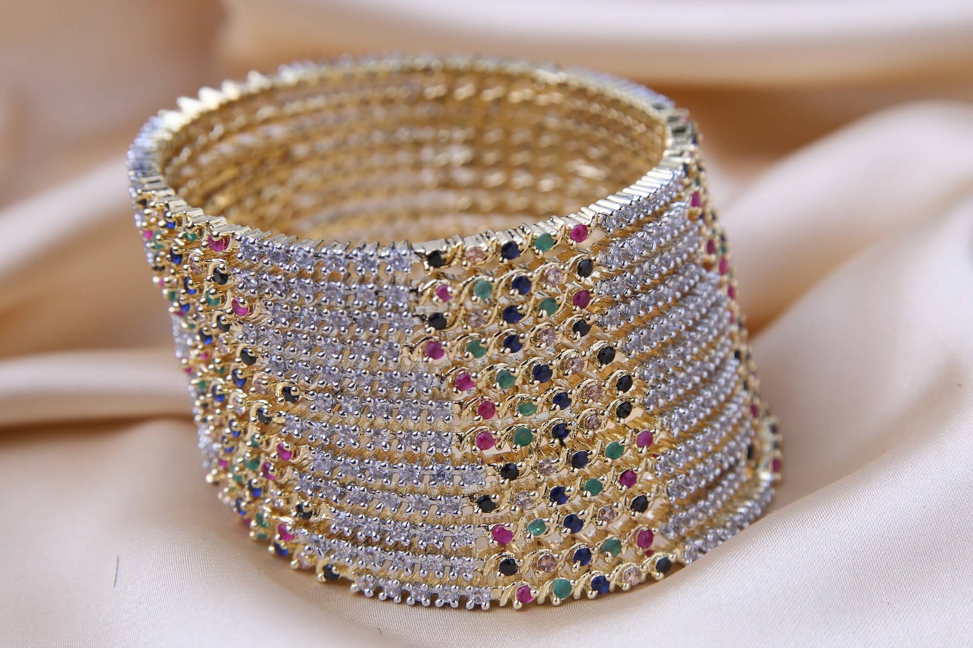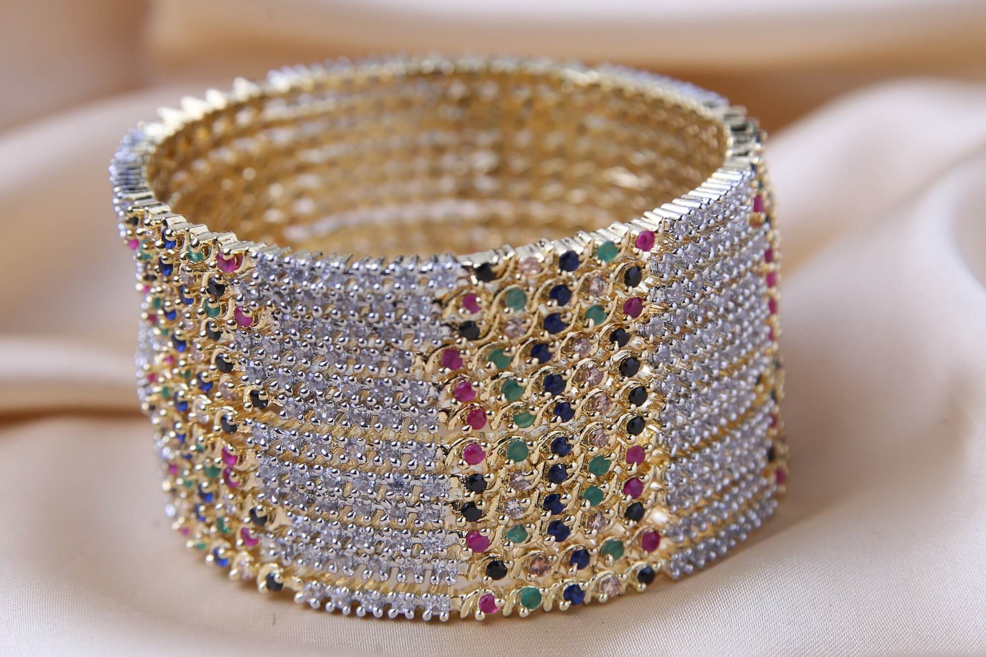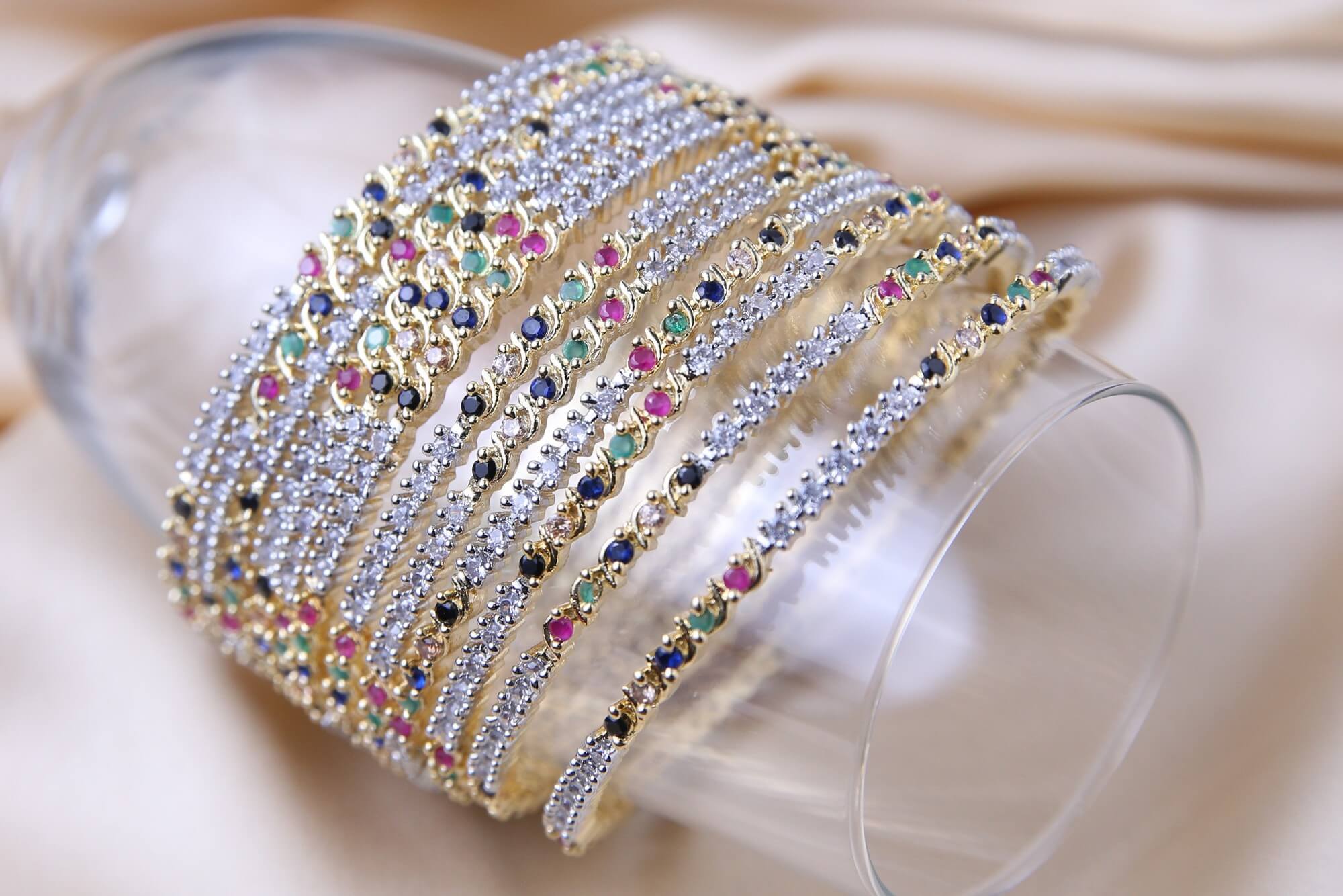 Elevate your style with this exquisite set of 12 bangles. Each bangle is meticulously crafted with a radiant gold-toned finish, lavishly adorned with dazzling clear cubic zirconia stones. The set includes a variety of designs, featuring both wide and slender bangles, some with colorful accents of green, red, and blue stones. This versatile collection allows you to mix and match, creating a personalized and glamorous look for any occasion.