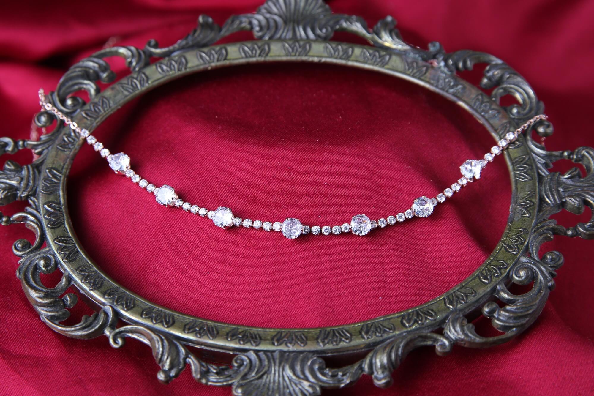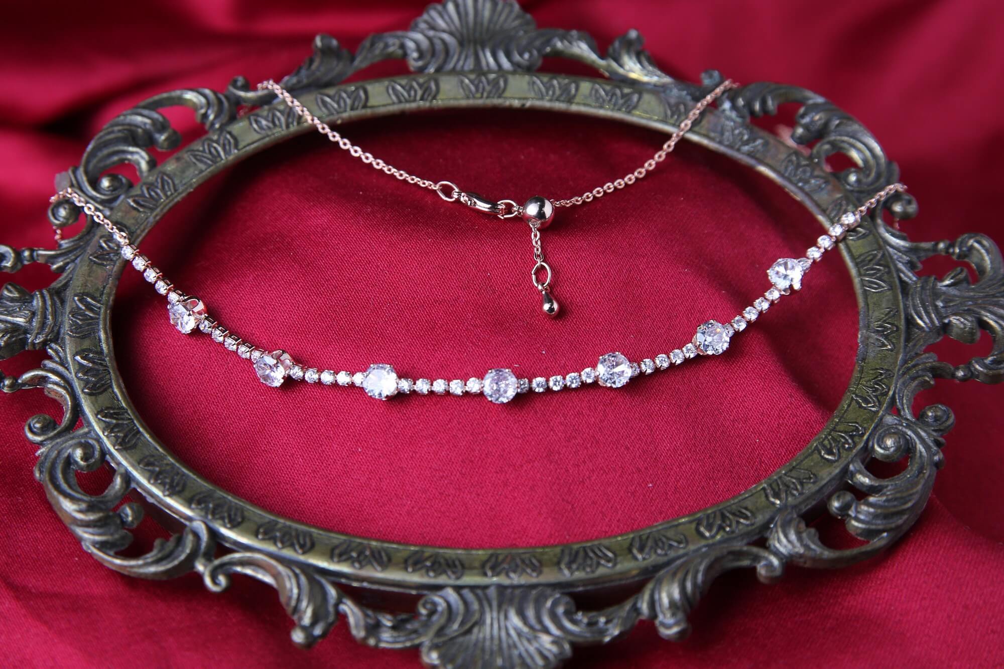This exquisite single-strand choker necklace makes a powerful statement with its continuous, brilliant sparkle and warm rose gold-tone finish. The design features a delicate chain interspersed with larger, round-cut cubic zirconia stones set in polished bezels. These prominent stations are linked by smaller, micro-pave set cubic zirconia crystals, creating a rich, seamless band of light. The piece is designed to sit high on the neckline, adding immediate glamour. Secured with a lobster clasp and an adjustable extender chain, this choker is a refined accessory that promises to be a captivating focal point for any special occasion or elegant evening out.