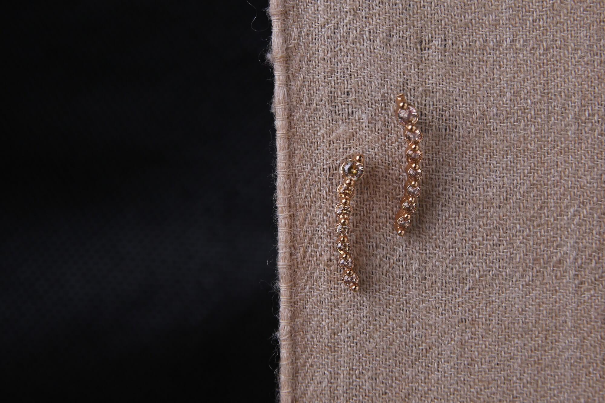These glamorous ear climbers display a series of clear diamonds or crystals set in gold. The stones are arranged in an elegant curved line that ascends the earlobe. Each small stone catches the light beautifully. Their understated luxury makes them perfect for both everyday wear and special events.