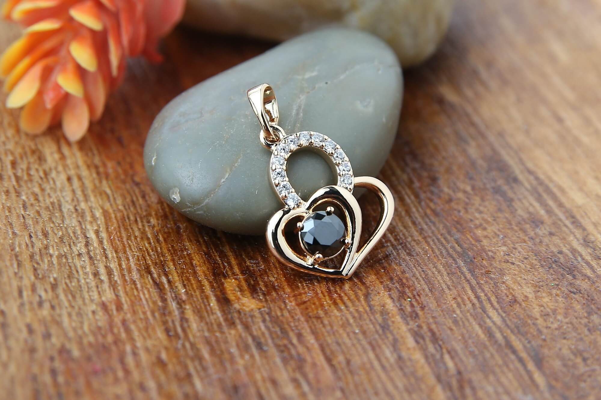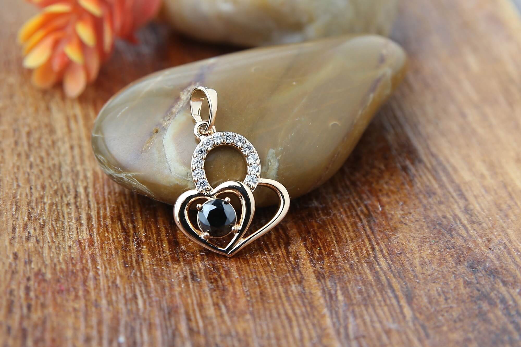 A delicate gold pendant with two intertwined hearts set with sparkling diamonds and a single black gem. The pendant hangs on a delicate chain, making it the perfect romantic gift.