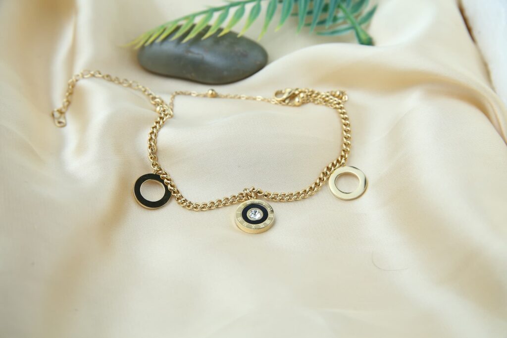This chic anklet has three round pendants on a gold-toned chain. The other two pendants are smaller and finished in black enamel, while the central pendant is larger and has a dazzling rhinestone. Any ensemble would benefit from the subtle elegance that an anklet can bring to it.