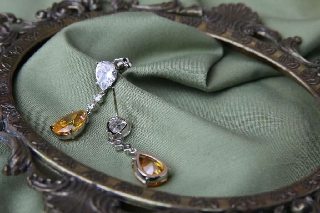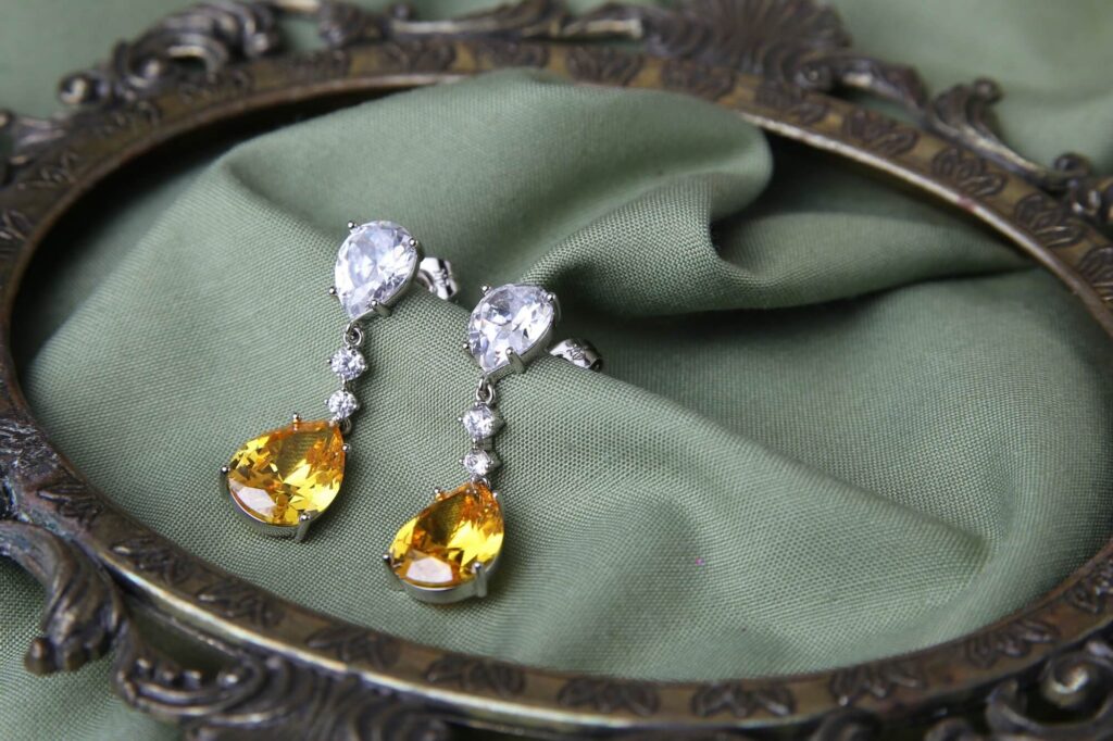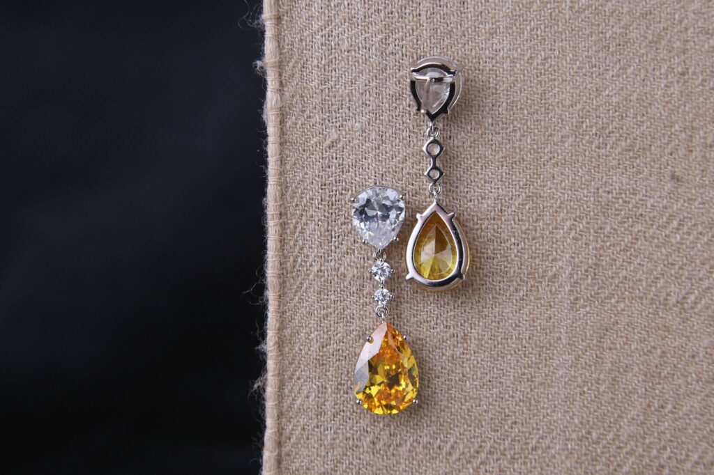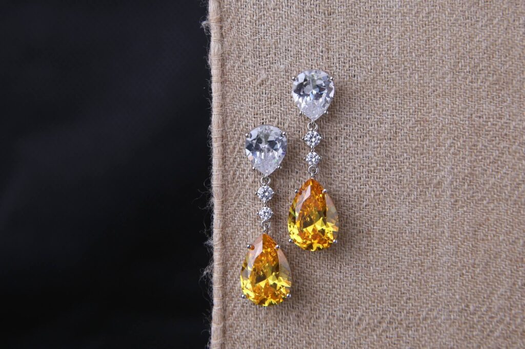 These sophisticated dangle earrings feature a striking combination of clear and golden teardrop gemstones, linked by sparkling white stones. The design exudes luxury and grace, making them the perfect choice for evening wear, weddings, or any special occasion. Their refined elegance adds a radiant charm to any outfit.