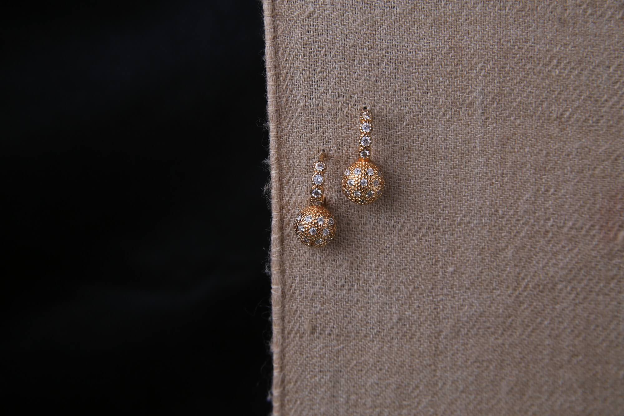 Add a touch of luxury to your jewelry collection with these stunning gold pavé hoop earrings. Designed with a classic hoop silhouette, these earrings feature dazzling pavé-set stones along the curve, leading to a round charm encrusted with shimmering crystals. The intricate detailing and refined craftsmanship make these earrings a statement piece, perfect for both everyday elegance and special occasions. Their timeless appeal ensures they complement a wide range of styles, from sophisticated evening wear to chic casual outfits. A must-have for those who appreciate exquisite and eye-catching jewelry.