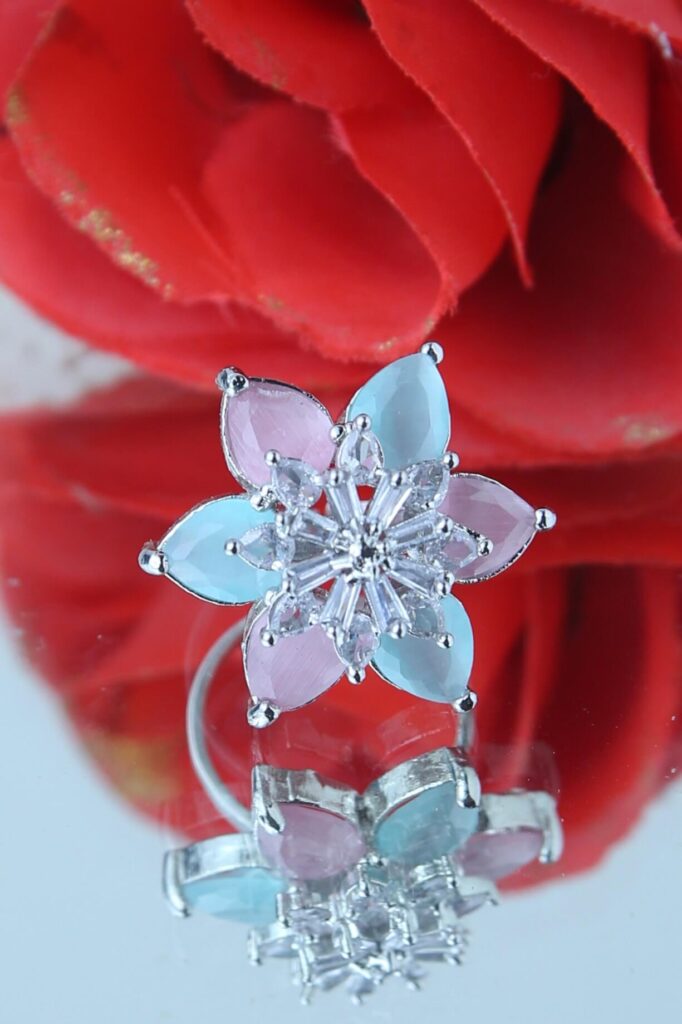 With our Elegant Pastel Bloom Ring, a stunning piece influenced by the beauty of spring, you may embrace classic elegance. Delicate pastel gemstones in soft shades of blush pink and sky blue are set in a captivating flower design in this floral beauty. The exquisite craftsmanship and sparkling center stones lend a sense of elegance and sophistication to any look.