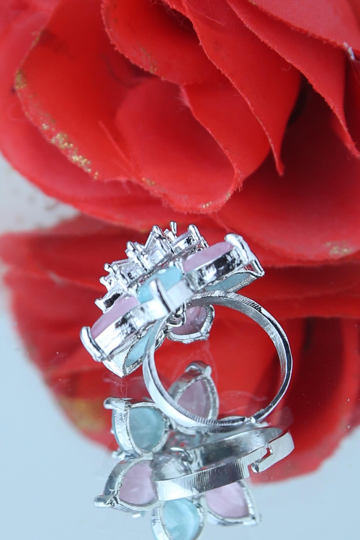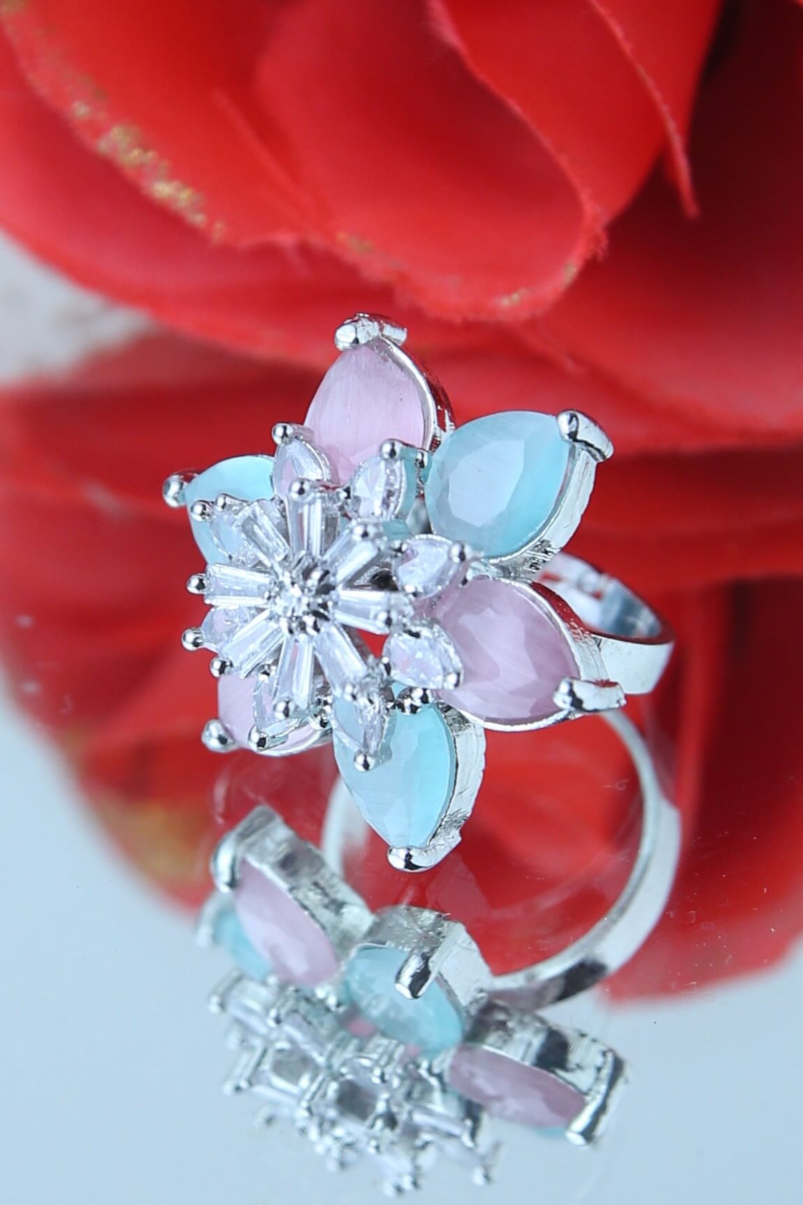 With our Elegant Pastel Bloom Ring, a stunning piece influenced by the beauty of spring, you may embrace classic elegance. Delicate pastel gemstones in soft shades of blush pink and sky blue are set in a captivating flower design in this floral beauty. The exquisite craftsmanship and sparkling center stones lend a sense of elegance and sophistication to any look.