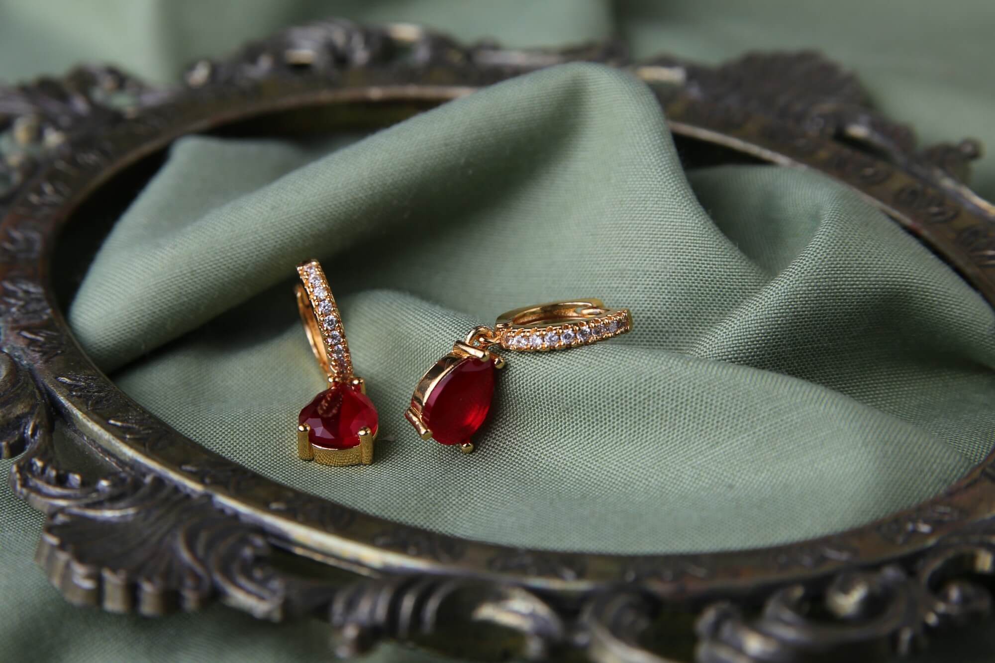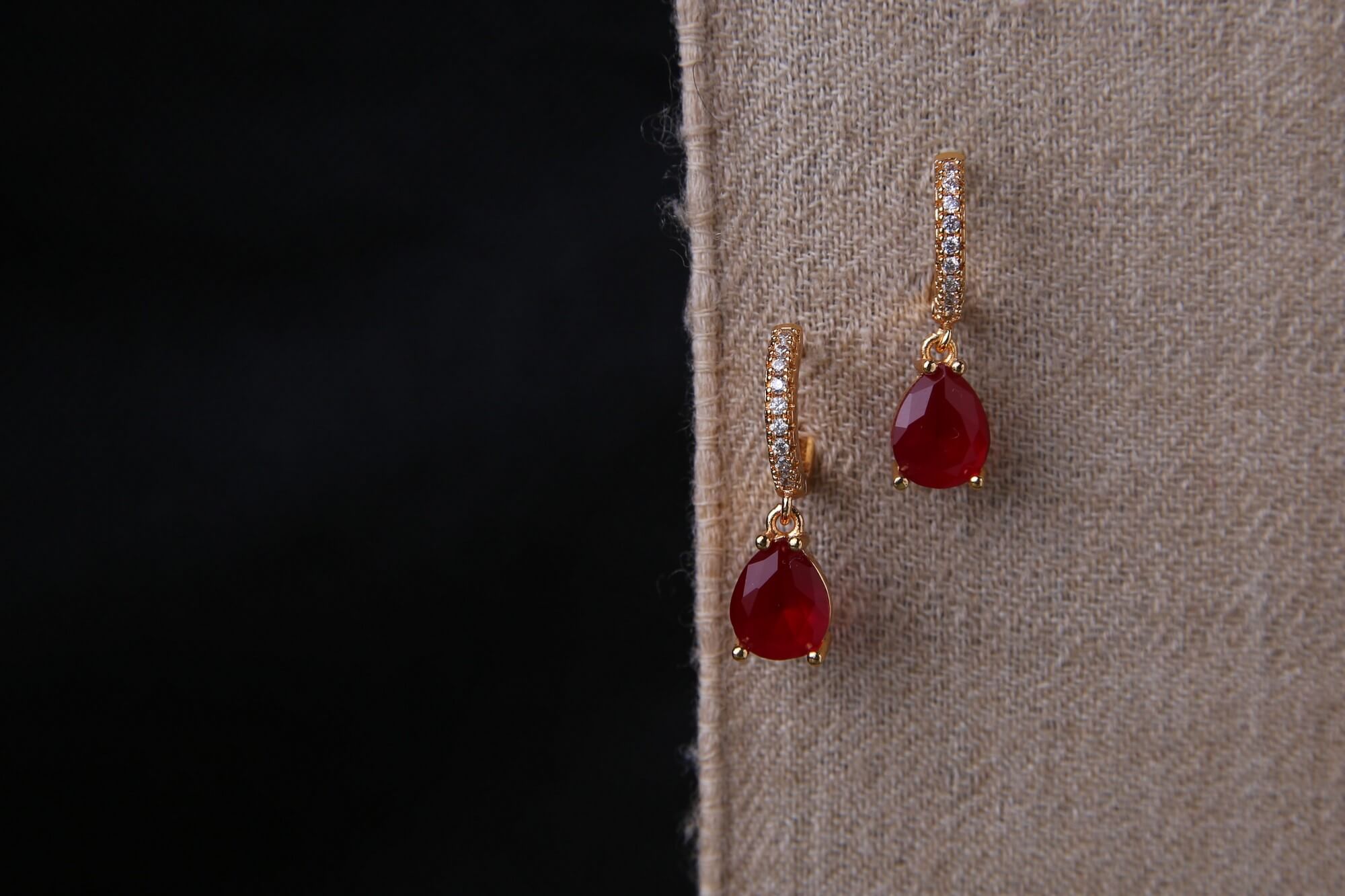 Add a touch of glamour to your look with these breathtaking gold-plated earrings with gold and crystal accents, featuring dazzling red teardrop gemstones. Suspended from a delicate, crystal-encrusted hoop, these earrings radiate luxury and sophistication. Perfect for evening wear or a bold statement with casual outfits, these earrings are designed for those who love timeless elegance with a modern twist. These earrings are perfect for gifting to your loved ones.