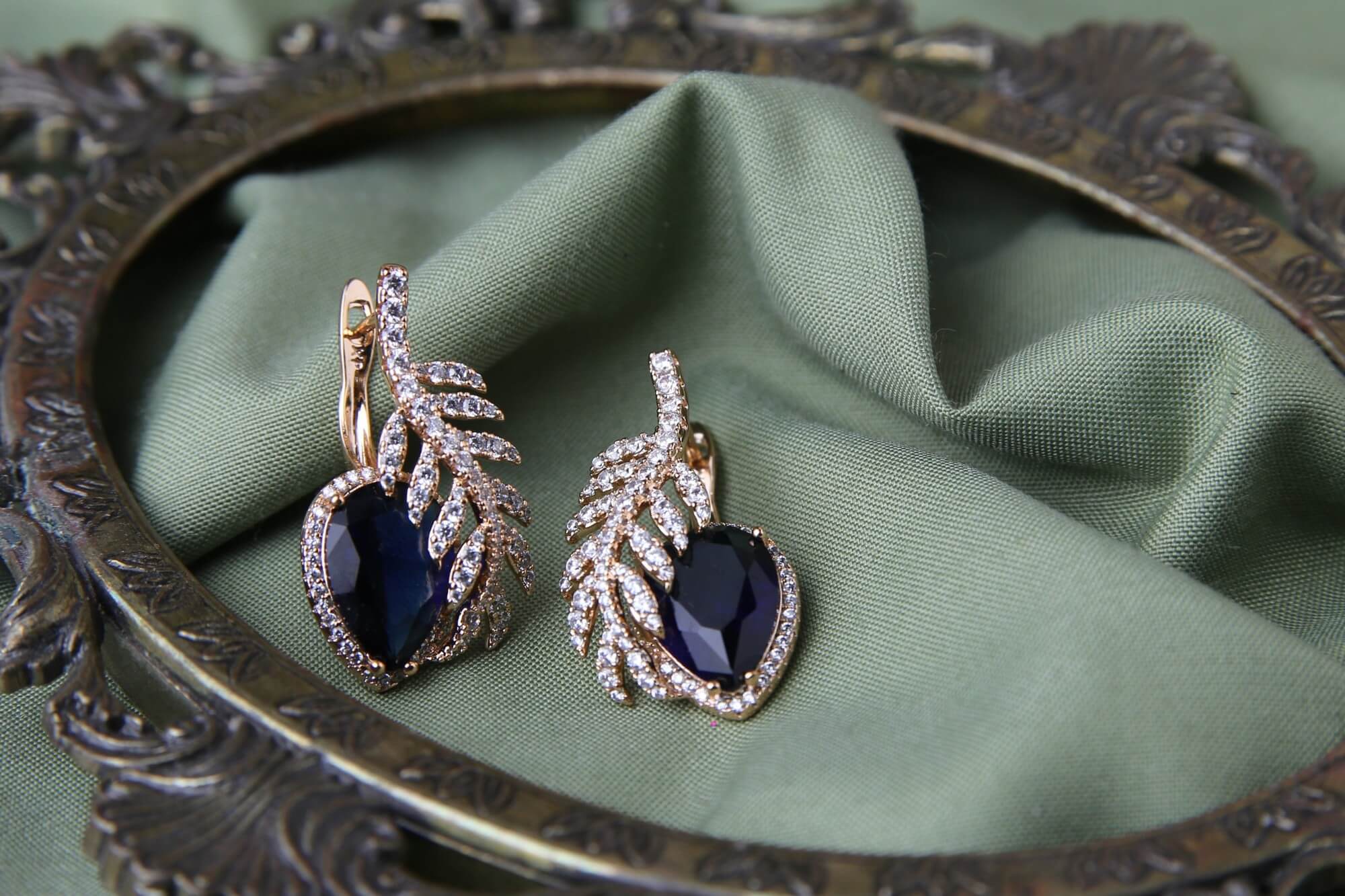 Indulge in the timeless charm of these exquisite sapphire and diamond leaf earrings, a perfect blend of sophistication and nature-inspired elegance. Crafted with precision, each earring features a deep blue, heart-shaped sapphire, encased in a delicate frame of shimmering diamonds. The intricate leaf design, adorned with meticulously placed diamonds, adds a touch of grace and refinement, making these earrings a statement of luxury. Set in a lustrous gold base, this stunning pair is an ideal accessory for formal occasions, weddings, or any special event where you want to shine with elegance.