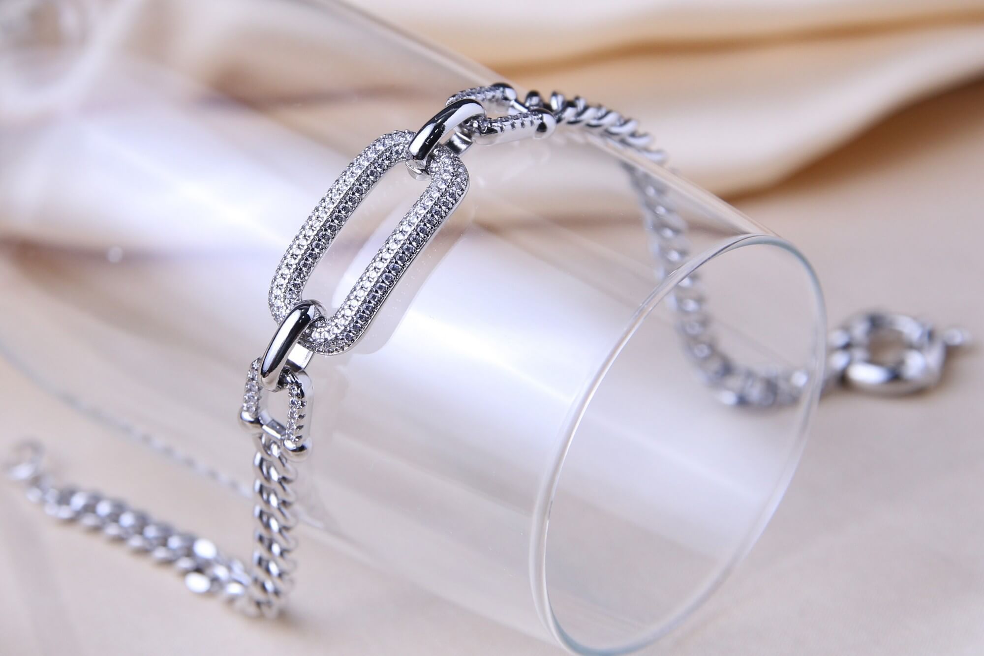 This sophisticated bracelet features a series of interconnected, smooth, silver-toned links, creating a refined and versatile accessory. The bracelet’s design is highlighted by a central, elongated rectangular detail, adding a touch of modern elegance. This piece is perfect for adding a subtle yet noticeable touch of style to both casual and more formal outfits. The secure clasp ensures a comfortable and reliable fit, making it ideal for all-day wear.