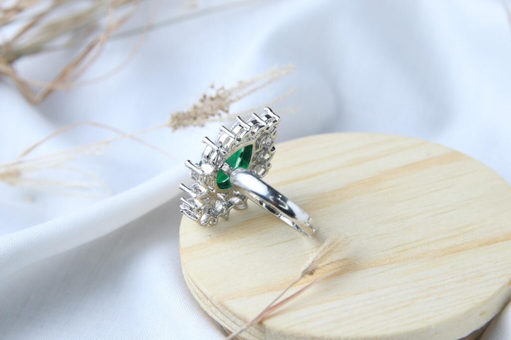 Inspired by royal jewelry designs, this sophisticated ring showcases a brilliant pear-shaped emerald crystal surrounded by a spectacular halo of marquise and round-cut diamonds. The meticulously arranged stones create a sunburst effect that frames the vivid green centerpiece. Elegant and eye-catching, this piece brings a touch of regal refinement to both formal events and everyday luxury wear.