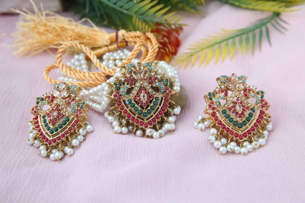 This gorgeous set of jewelry is an absolute masterpiece. A beautiful and classic item is created by the elaborate gold-toned pattern, which is embellished with vivid green emeralds, pink gemstones, and tiny pearls. The choker is ideal for any special occasion because of its exquisite pearl strand and matching earrings. This collection is a must-have for every jewelry enthusiast because of the exquisite craftsmanship and vivid colors.