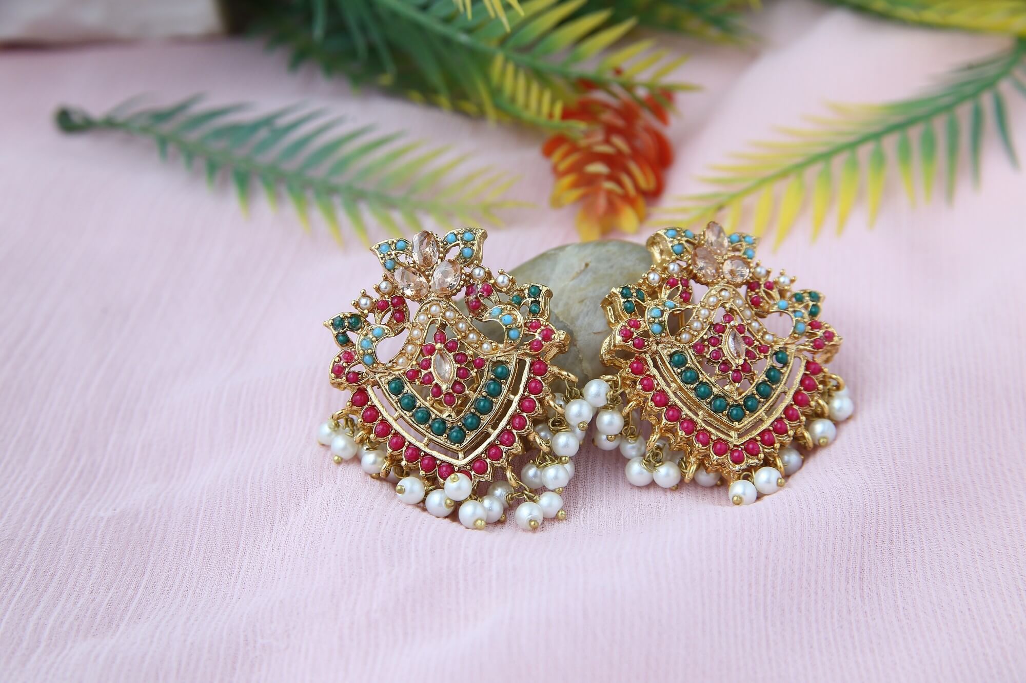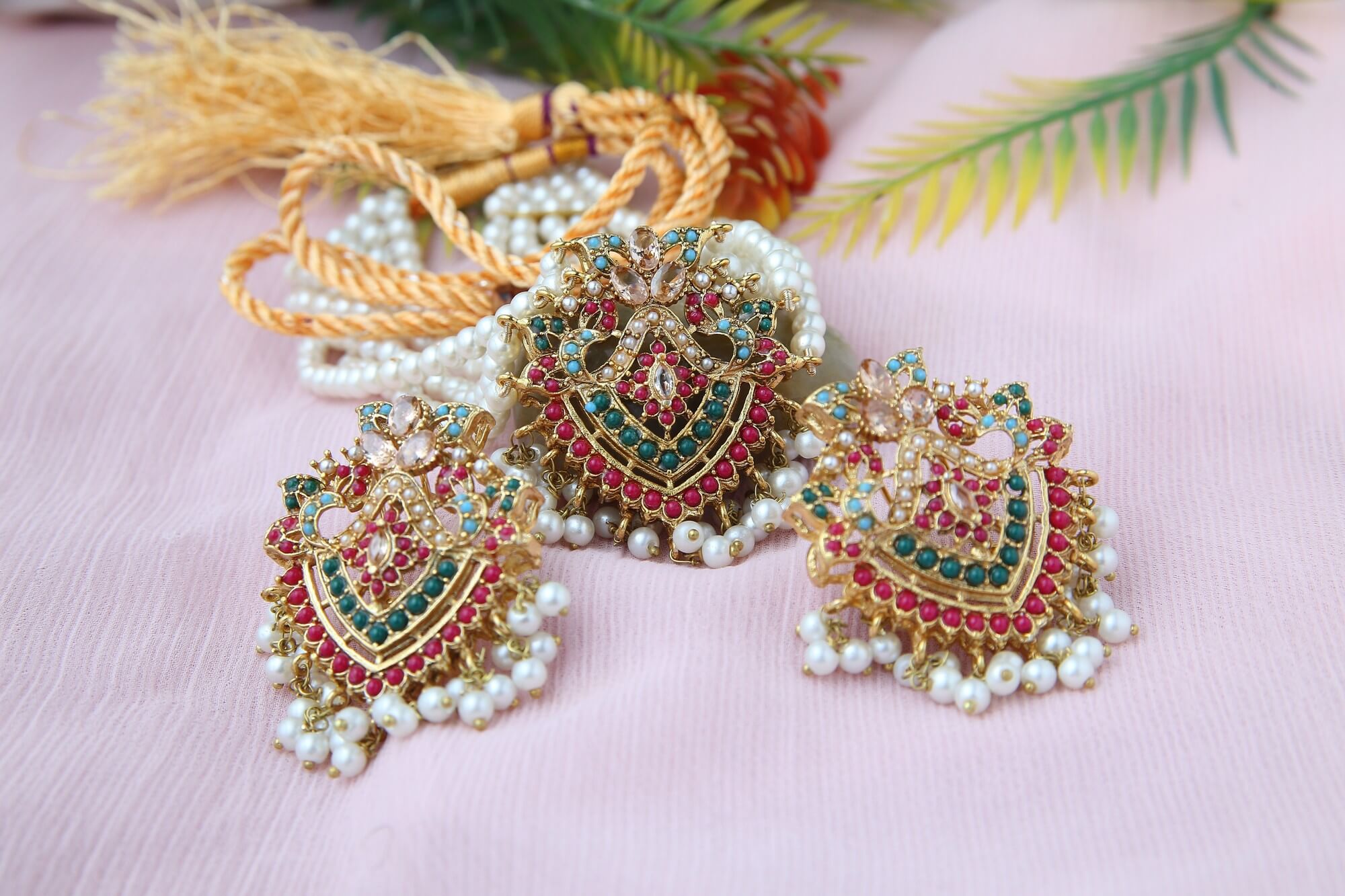 This gorgeous set of jewelry is an absolute masterpiece. A beautiful and classic item is created by the elaborate gold-toned pattern, which is embellished with vivid green emeralds, pink gemstones, and tiny pearls. The choker is ideal for any special occasion because of its exquisite pearl strand and matching earrings. This collection is a must-have for every jewelry enthusiast because of the exquisite craftsmanship and vivid colors.
