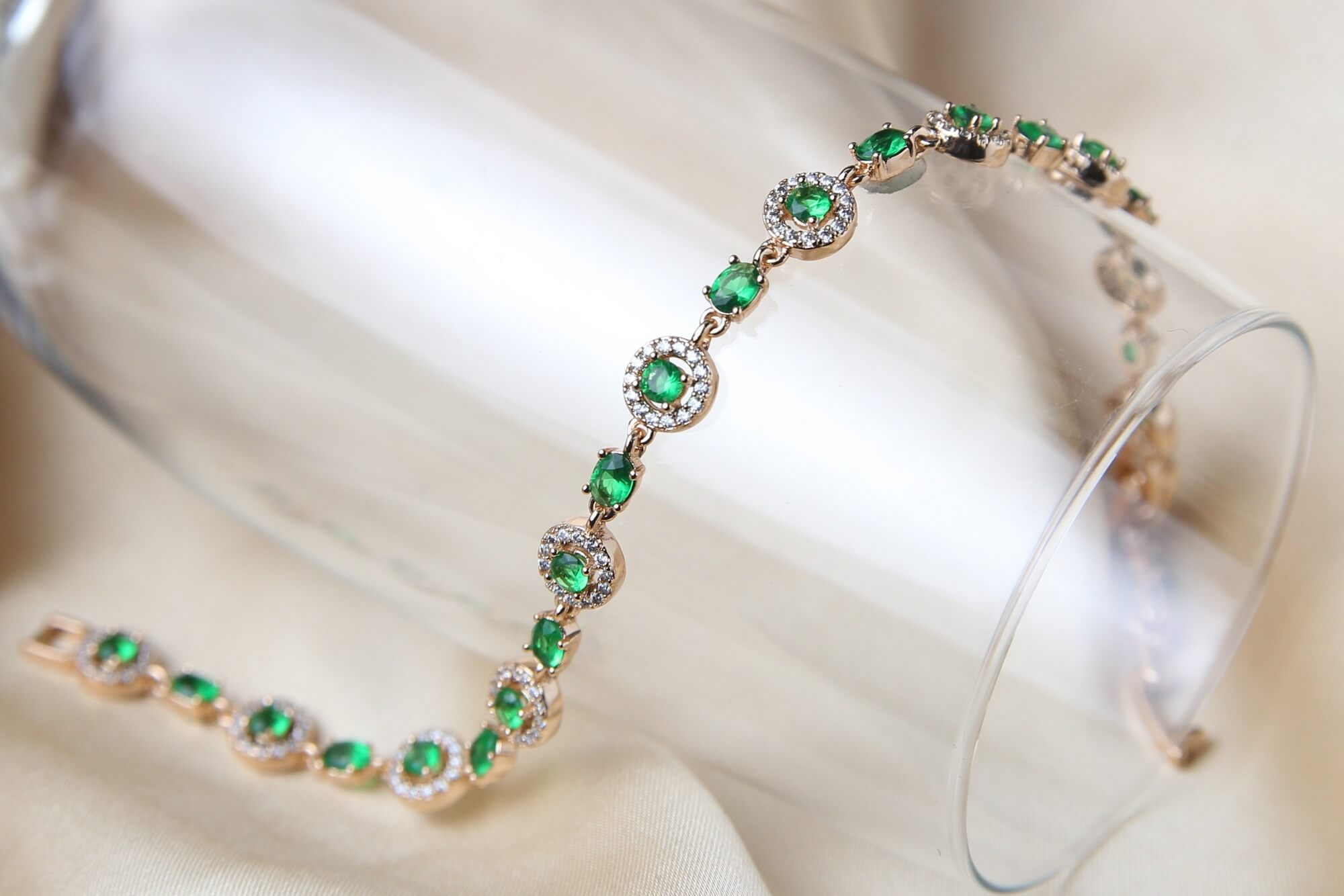 Embrace timeless elegance with this stunning bracelet, adorned with a captivating array of emerald-green stones. Each stone is meticulously faceted to maximize its brilliance, creating a dazzling display of vibrant color that will elevate any ensemble. The warm gold tone of the setting beautifully complements the rich green hues, adding a touch of luxury and sophistication. The delicate design and comfortable fit make it perfect for everyday wear, while the sparkling emerald-green stones ensure you’ll stand out with an understated elegance.