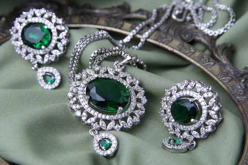 Indulge in the captivating allure of this exquisite jewelry set, featuring vibrant emerald-green stones embraced by a dazzling halo of clear crystals, all set in a polished silver tone. This ensemble includes a striking pendant necklace and a pair of elegantly matching drop earrings, designed to add a touch of sophisticated glamour to any occasion. The focal point of the necklace is a substantial, oval-cut emerald-green stone, its rich, verdant hue immediately drawing the eye.Mirroring the elegance of the pendant, the earrings feature a similar floral-inspired design at the stud. This set is perfect for adding a touch of refined luxury and vibrant color to special occasions, making you feel effortlessly glamorous.