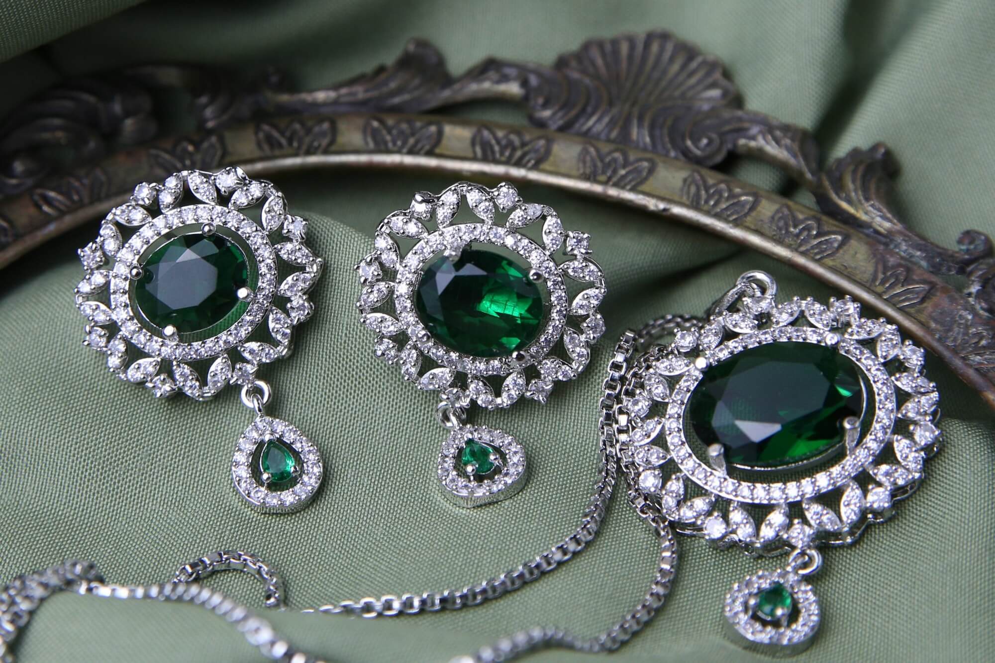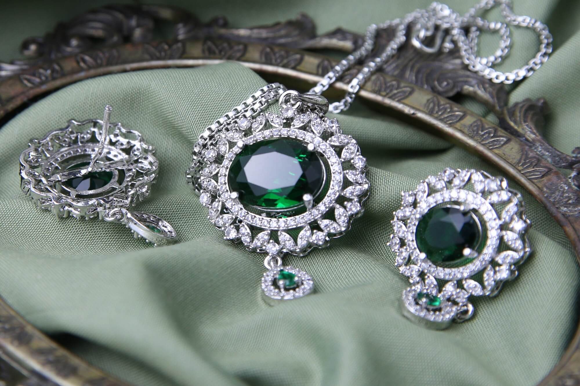 Indulge in the captivating allure of this exquisite jewelry set, featuring vibrant emerald-green stones embraced by a dazzling halo of clear crystals, all set in a polished silver tone. This ensemble includes a striking pendant necklace and a pair of elegantly matching drop earrings, designed to add a touch of sophisticated glamour to any occasion. The focal point of the necklace is a substantial, oval-cut emerald-green stone, its rich, verdant hue immediately drawing the eye.Mirroring the elegance of the pendant, the earrings feature a similar floral-inspired design at the stud. This set is perfect for adding a touch of refined luxury and vibrant color to special occasions, making you feel effortlessly glamorous.