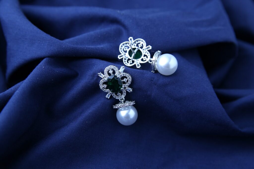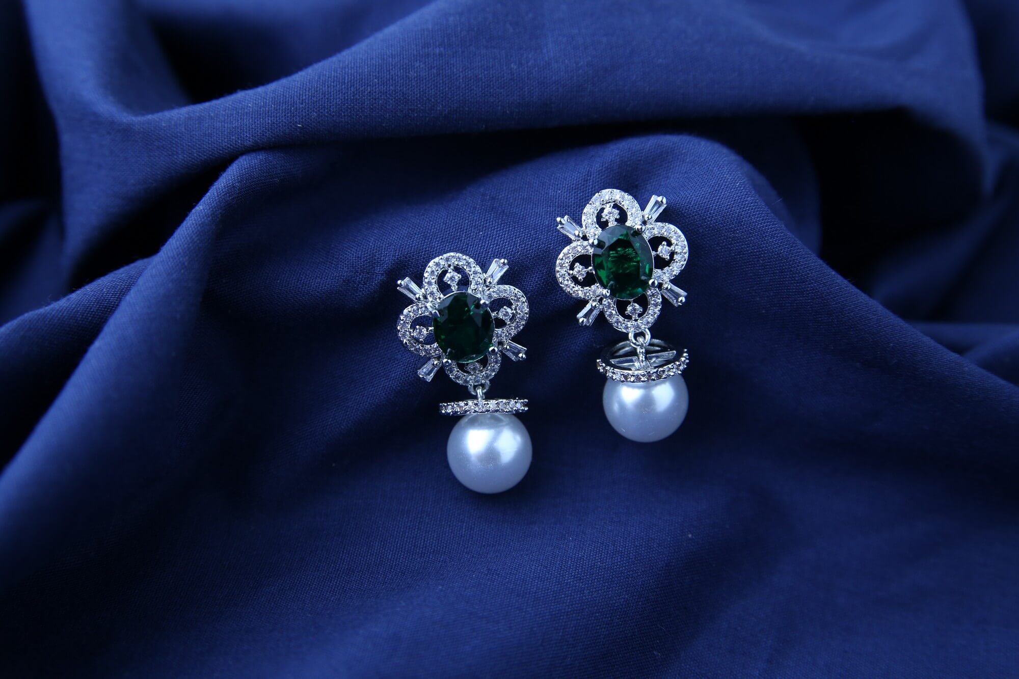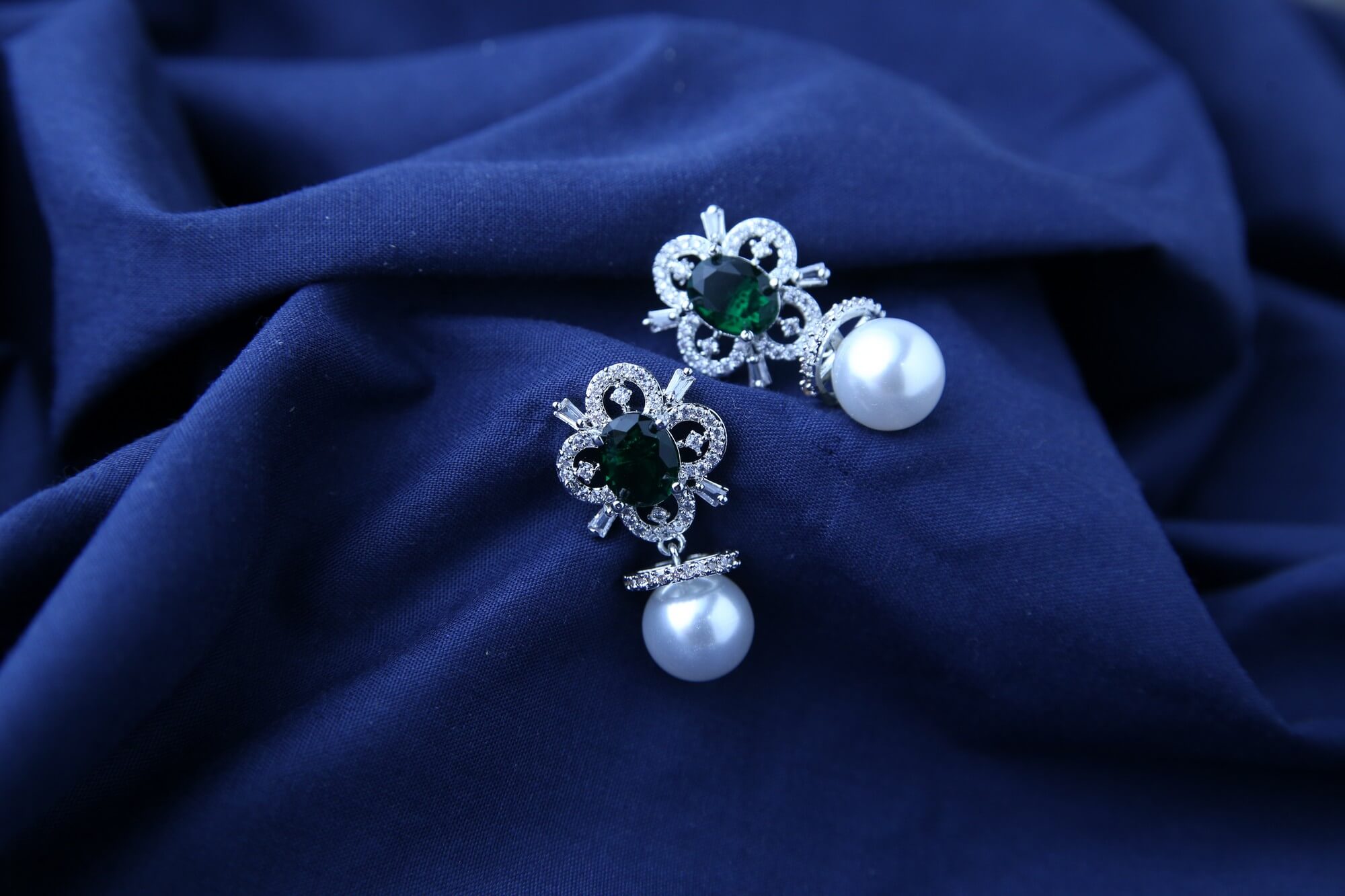 Capture the essence of spring with these Emerald Pearl Blossom Earrings. Delicate floral designs, crafted with shimmering crystals, form the centerpiece of these elegant earrings. A vibrant emerald stone glows at the heart of each blossom, adding a touch of rich color and captivating depth. A lustrous pearl dangles gracefully below, completing the sophisticated and feminine design. These earrings are the perfect accessory for adding a touch of glamour and natural charm to any occasion.